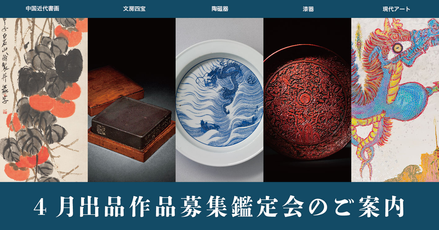 中国書画、拓本、手紙、古書籍、陶瓷器、玉器、青銅器、文房、印材、家具、茶道具、香木、酒、現代アートなど幅広いジャンルの作品を随時募集中!