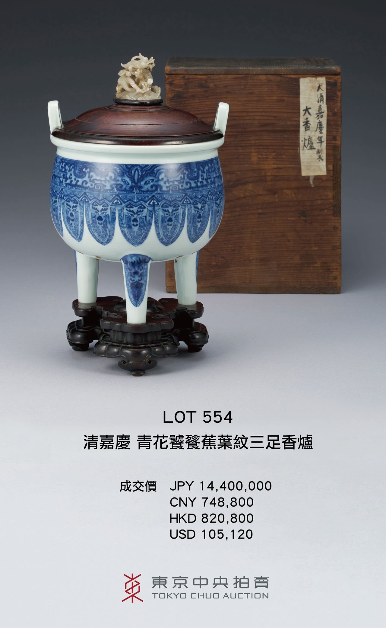 瓷器拍賣亦成績驕人。Lot 554 清嘉慶 青花饕餮蕉葉紋三足香爐亦以逾一千四百萬日元成交,摘瓷器類別桂冠。明星拍品Lot 546 清康熙 青花五彩龍鳳碗亦以逾九百八十萬日元成交,成績斐然。此次明星拍品眾多,詳見文末精選。