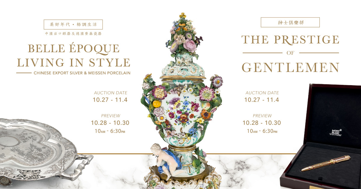 “Belle Époque: Living in Style” online auction and exhibition will be held from 27 October to 4 November, featuring two important collections, “Chinese Export Silver & Meissen Porcelain” and “The Prestige of Gentlemen”. More than 200 pieces of Meissen tablewares, silverwares, Montblanc fountain pens, cufflinks, pipes and lighters etc. will be exhibited. Come visit us and discover the craftsmanship.