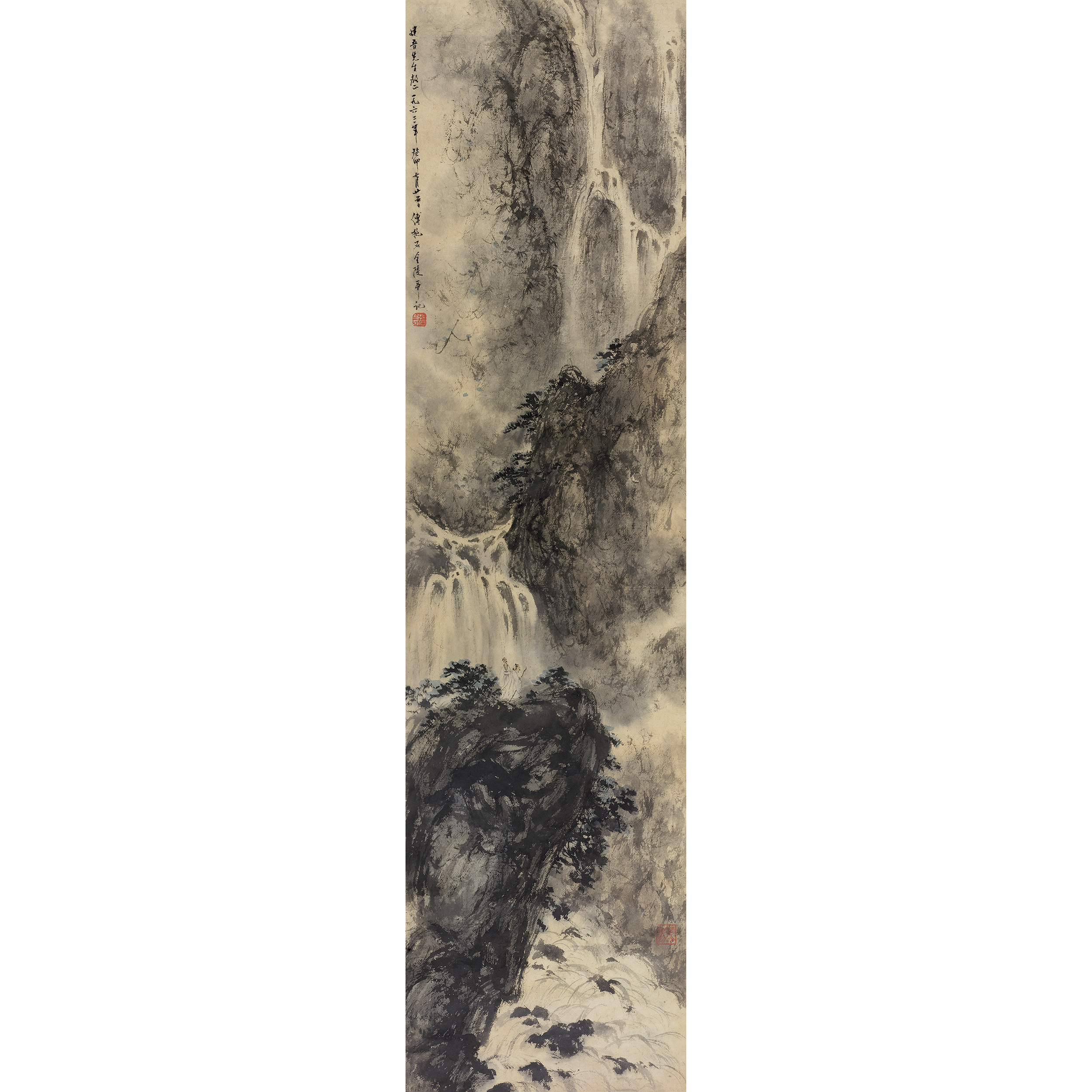 說明:是作成於1963年,乃傅抱石晚年觀瀑題材作品之力作。恰逢1961年遠赴東北采風,得以觀賞北方之河川,經醞釀與沉澱,可謂達到了對此題材演繹的全新境界。眼前是作即是傅抱石最擅長的泉瀑雨霧之景,長幅之內繪高山流水,高士觀瀑,山澗流水濤濤而下,留白模擬瀑布,浩蕩磅礡如有疑似銀河落九天之勢。景中高士以細筆畫出,置於山頂的林木之中,在壯闊的山川瀑布面前,顯得十分渺小,更營造出自然和諧共生之感,令人仿佛置身於畫中。此作風格成熟,用筆奔入不羈,氣勢恢宏。傅抱石憑借濃重的渲染,將線、皴統合,更將豪邁的筆墨氣韻融入景色之間,令山水氣勢豁然於眼前。