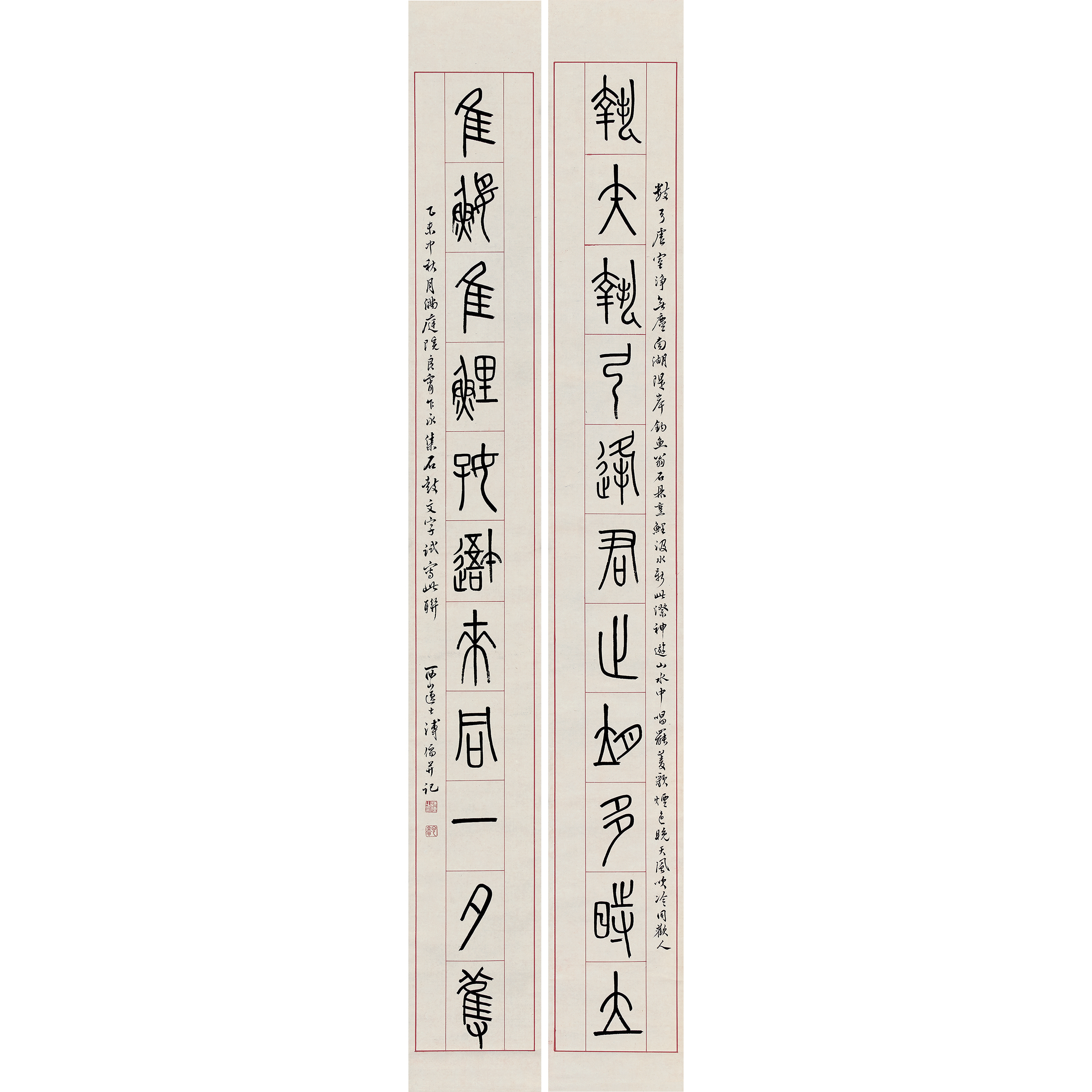 款識:數弓虛室凈無塵,南湖堤岸釣魚翁,石林烹鯉汲水新,此際神遊山水中,唱罷菱歌煙色晚,天風吹冷同歡人。乙未中秋,月滿庭院,良宵乍永,集石鼓文字試寫此聯。西山逸士溥儒並記。