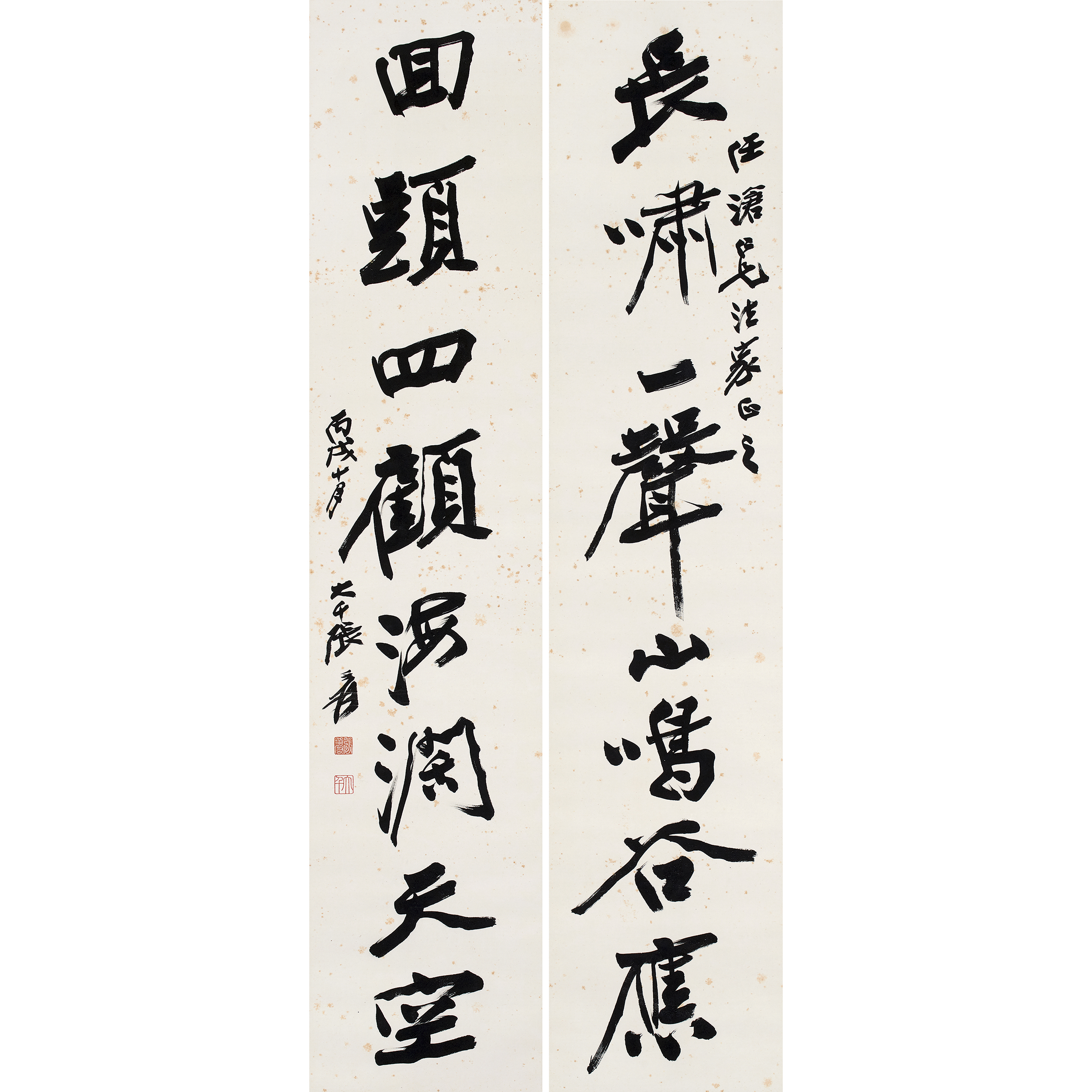 釋文:長嘯一聲山鳴谷應,回頭四顧海闊天空。作者簡介:張大千 名爰,字季爰,號大千居士,四川內江人。無論是繪畫、書法、篆刻、詩詞都無所不通,尤善山水。一生充滿傳奇,如曾赴日學染織,又入寺為僧,並在戰火中遠赴敦煌臨摹壁畫等。後旅居海外,畫風工寫結合,重彩、水墨融為一體,尤其是潑墨與潑彩,開創了新的藝術風格,更被譽為近代繪畫史上一大家。