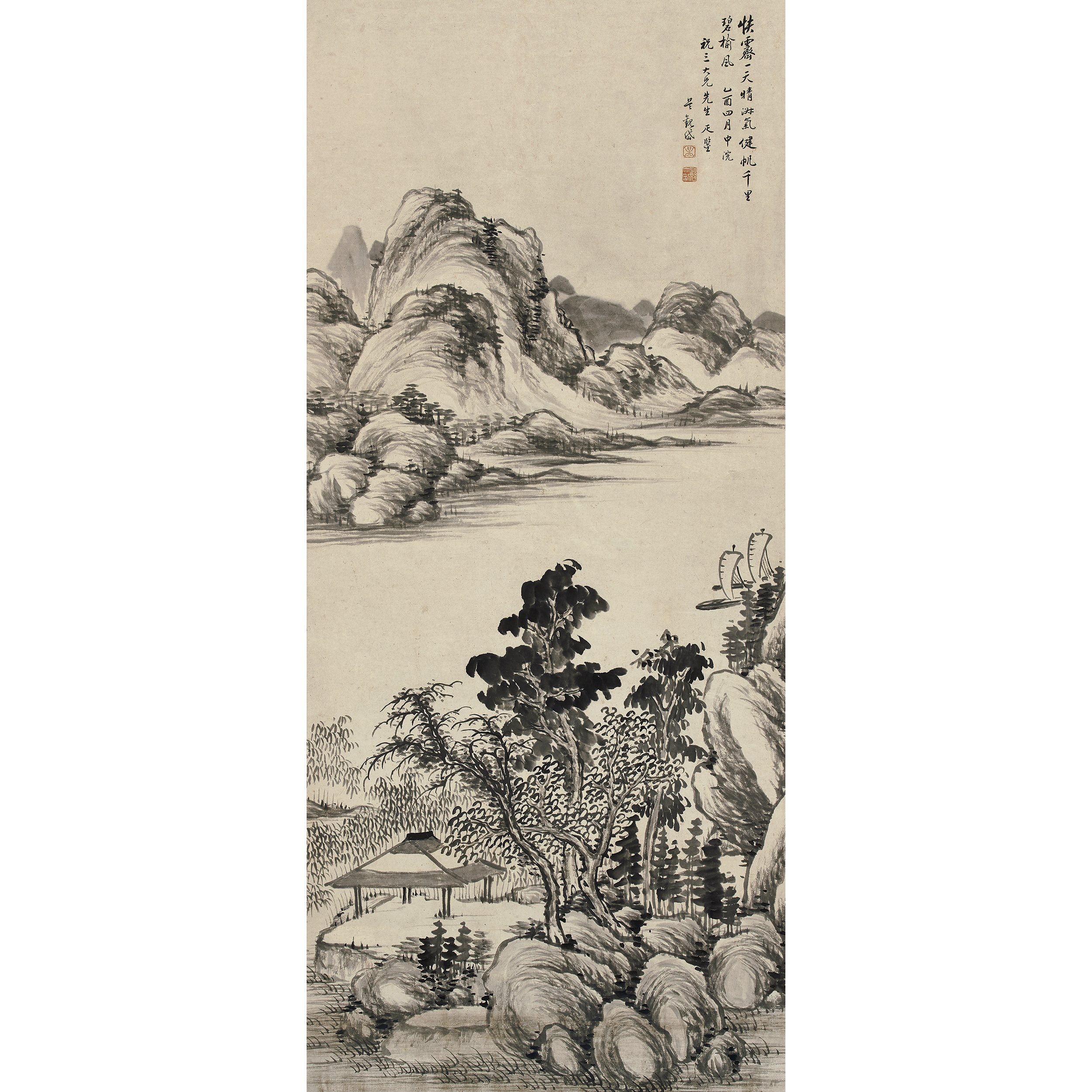 款識:快霽一天清淑氣,健帆千裏碧榆風。己酉四月中浣,祝三大兄先生正鑒。吳觀岱。