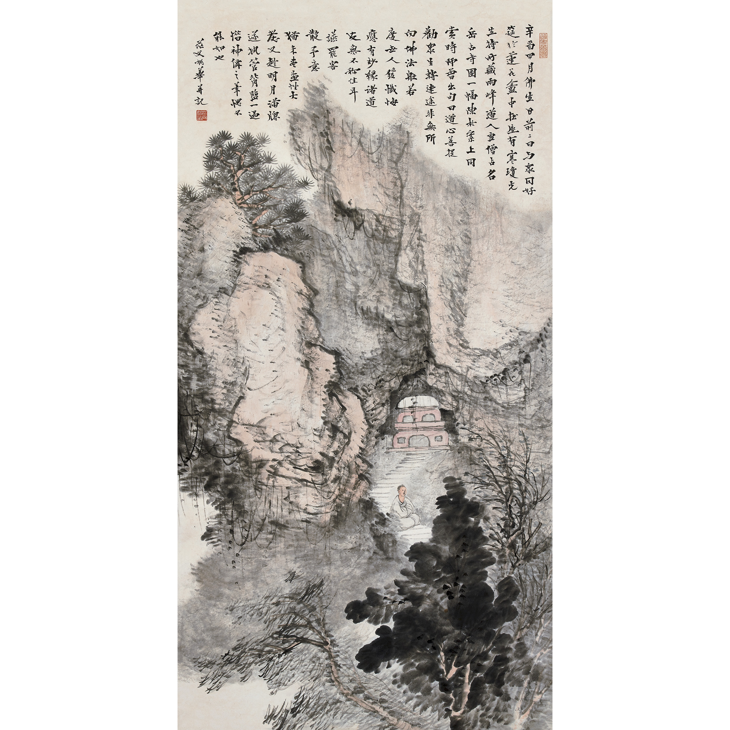 款識:辛酉四月佛生日前兩二日,與眾同好筵於蓮花盦中,在座有寒瓊先生持所藏兩峰道人畫僧佔名岳古寺圖一幅,陳於案上同賞,時師曾出句曰:道心菩提勸眾生轉迷途。非無所聞,佛法般若度世人發懺悔,應有妙緣。諸道友無不稱佳耳。讌罷客散,予意猶未盡,畫性大發,又趁明月滿窗,遂執管背臨一過,惜神仙之筆愧不能如也。茫父姚華並記。