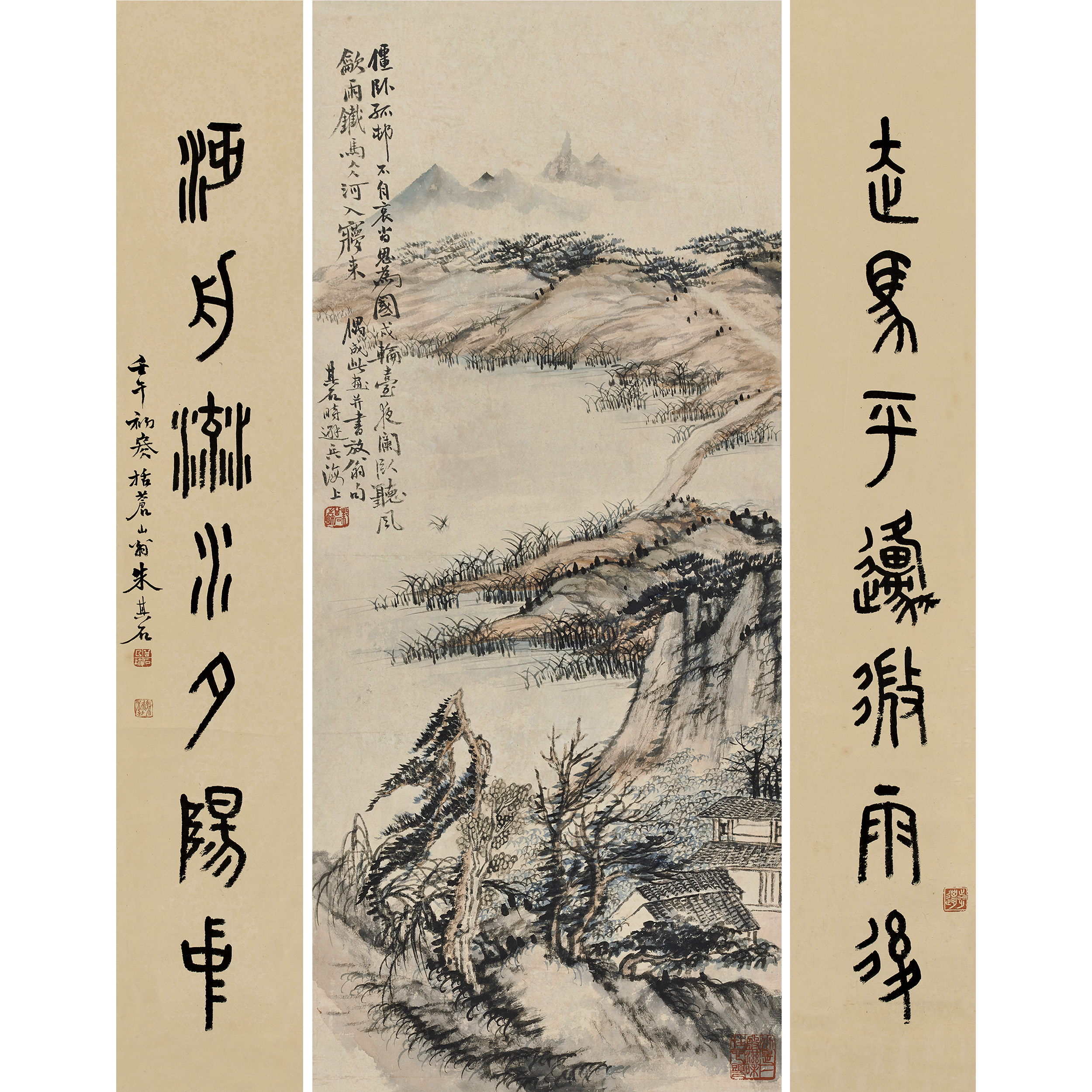 <對聯>壬午(1942)初冬,括蒼山翁朱其石。鈐印:其石私熙(白)、斬水之石惟其高矣(朱)、涉獵(白)