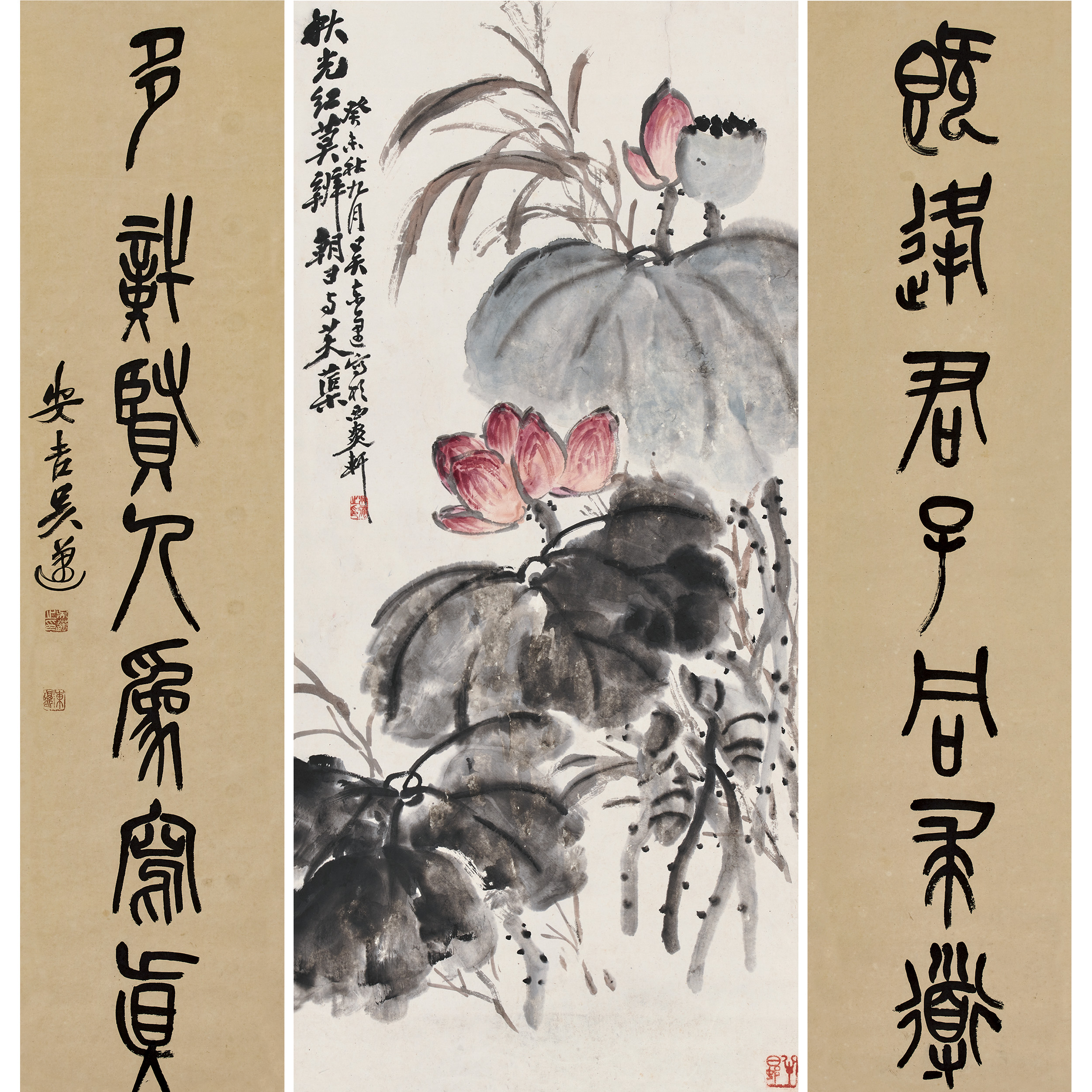 設色荷花 篆書七對句