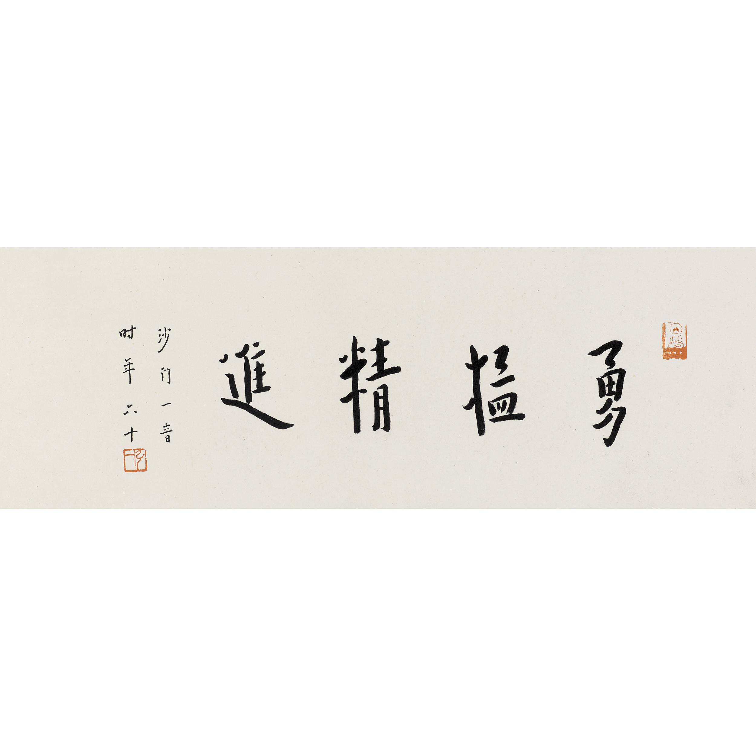 釋文:勇猛精進。作者簡介:弘一法師 李叔同,又名李息、李岸、李良,譜名文濤,幼名成蹊,學名廣侯,字息霜,別號漱筒。祖籍浙江平湖,生於天津。從日本留學歸國後,擔任過教師、編輯之職,後剃度為僧,法名演音,號弘一,晚號晚晴老人。