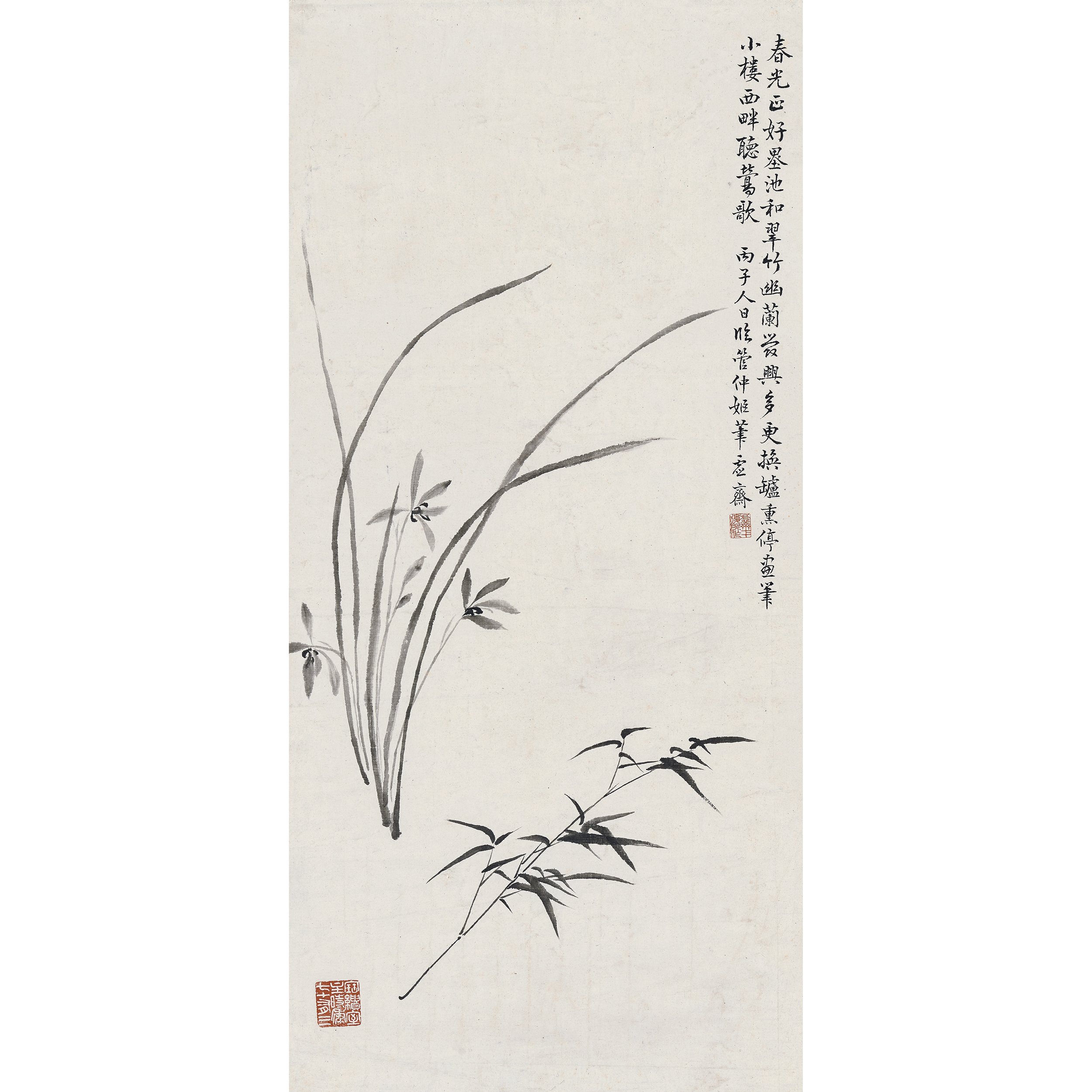 款識:春光正好,墨池和翠竹,幽蘭發興多,更換罏熏,停畫筆,小樓西畔聽鶯歌。丙子人日,臨管仲姬筆,虛齋。