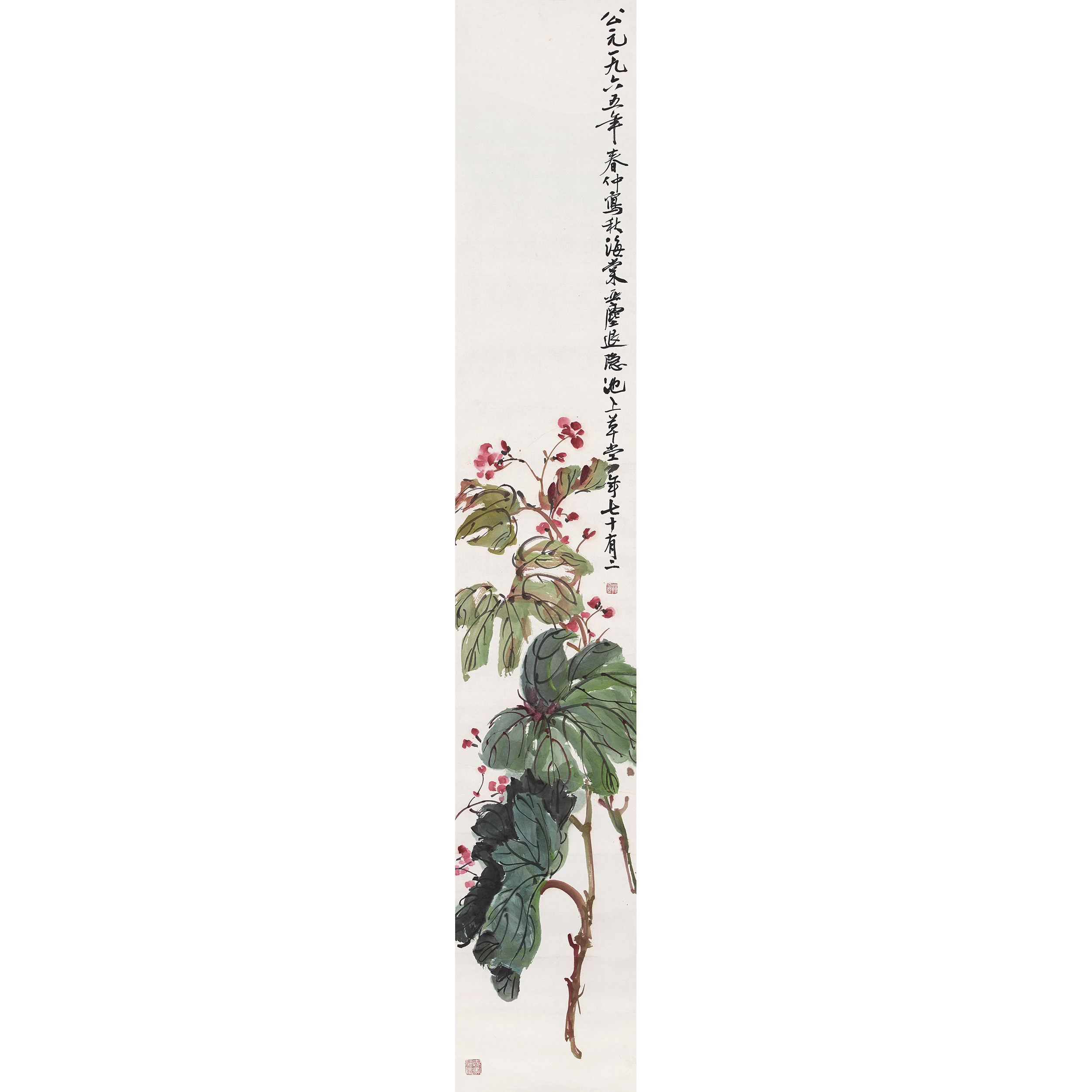 款識:公元一九六五年春仲寫秋海棠,亞塵隱退池上草堂,年七十有二。