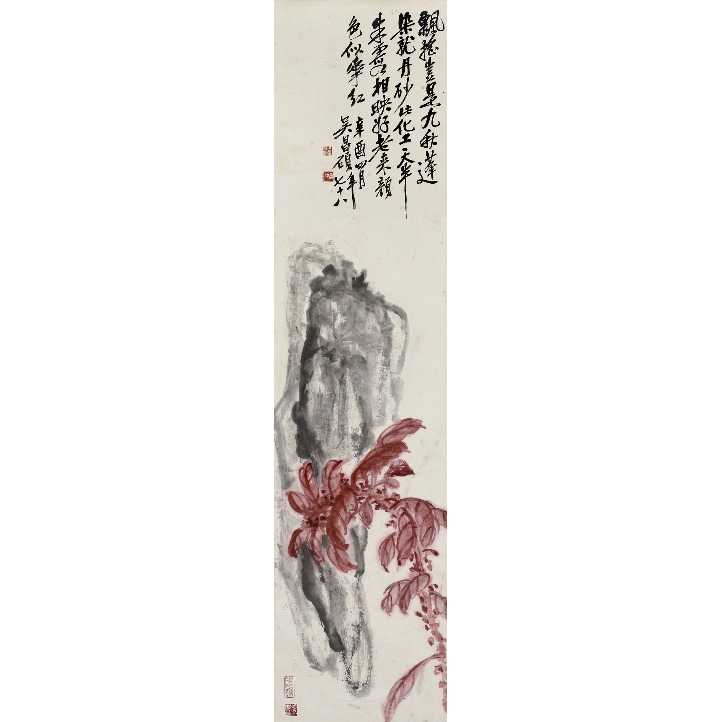 款識:飄搖豈是九秋蓬,染就丹砂此化工,天半朱霞相映好,老來顏色似花紅。辛酉四月,吳昌碩年七十八。