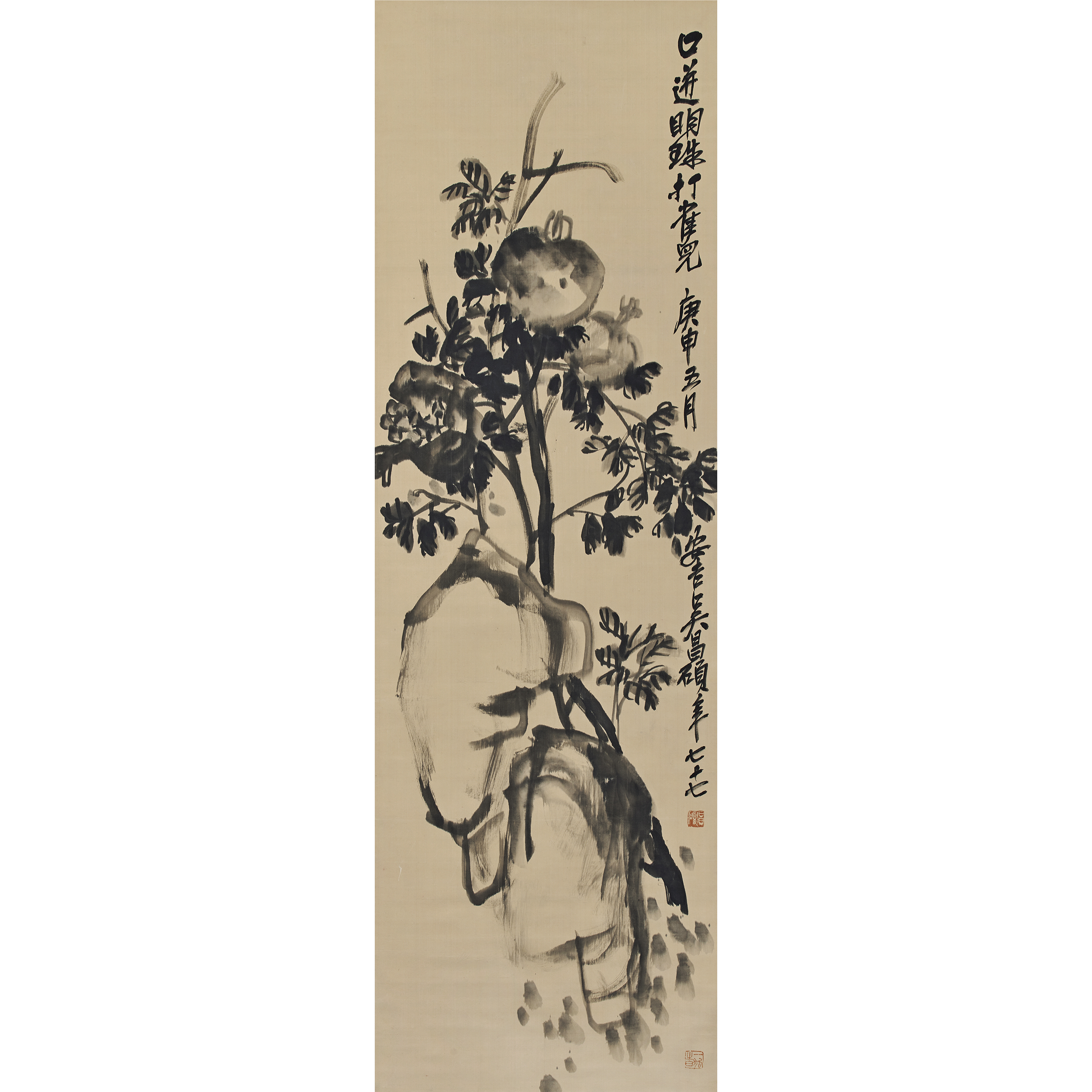 款識:口迸明珠打雀兒。庚申五月,安吉吳昌碩年七十七。