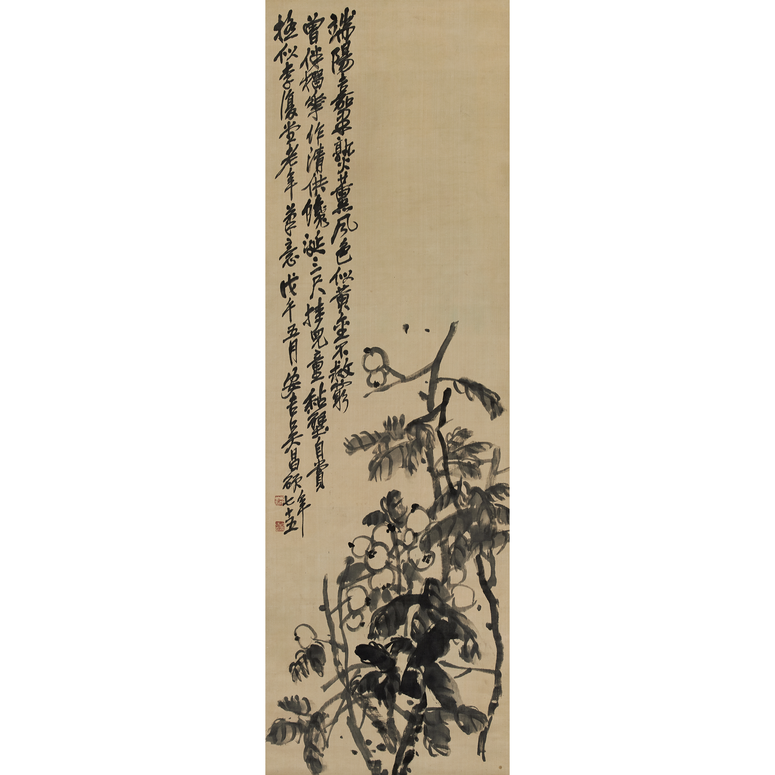 款識:端陽嘉果熟薰風,色似黃金不救窮,曾伴榴花作清供,饞涎三尺掛兒童。黏壁自賞,極似李復堂老年筆意。戊午五月,安吉吳昌碩,年七十五。