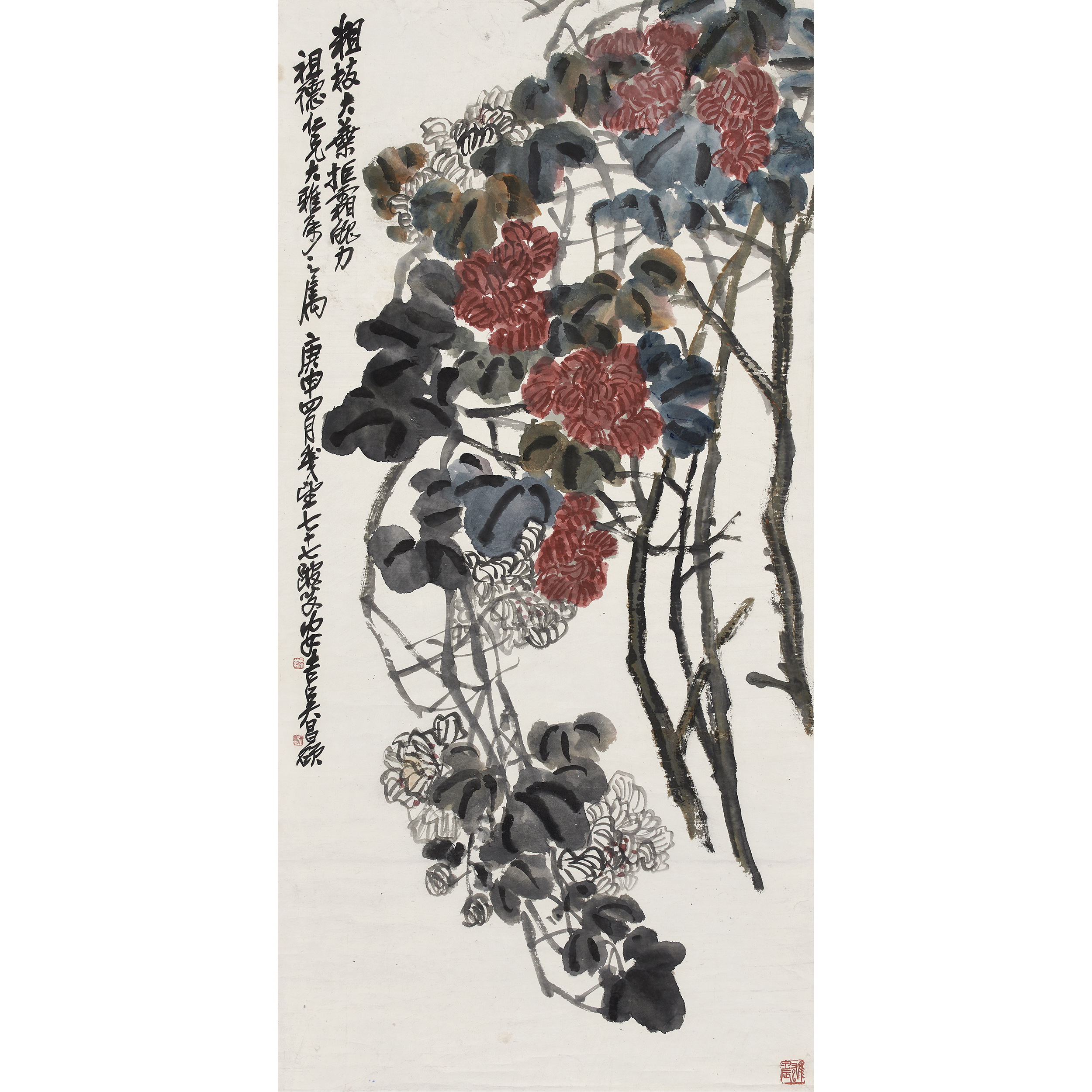 款識:粗枝大葉,拒霜魄力。祖德仁兄大雅屬之屬。庚申四月歲望七十七跛叟,安吉吳昌碩。