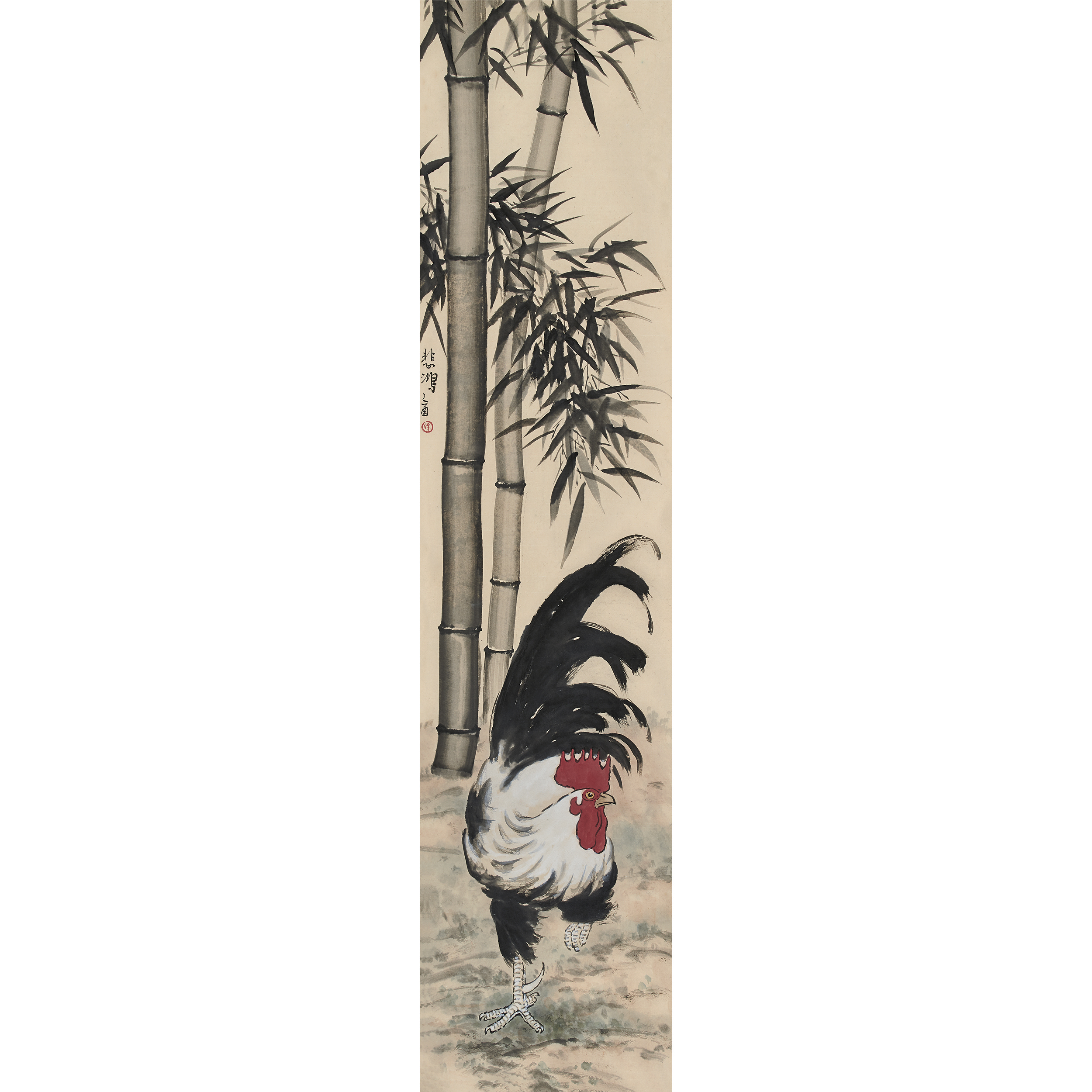 背景繪一竿墨竹,是悲鴻家鄉宜興丁蜀山的毛竹形態,為其最愛畫的竹之題材。竹直貫畫幅上下,葉片披靡略作點綴,具有頂天立地之氣勢。徐悲鴻畫竹頗有特點,他不依傳統畫法用毛筆一點點地畫,而是將宣紙鋪展在畫案上,用大板刷兩側蘸墨,而後一氣揮就。竹竿在水墨自然呈現的幹濕、濃淡狀態中,充分表現出圓潤的質感。竹子寓意“竹報平安,節節高升”,而“雞”寓意“大吉”,吉慶之意與生動之景相得益彰。