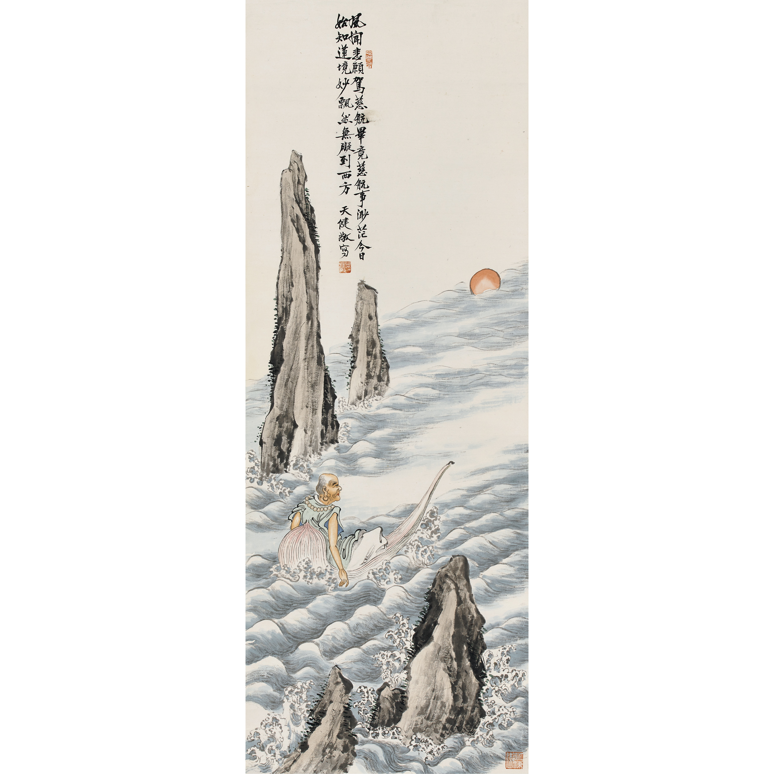 賀天健 原名賀駿,又名賀炳南,字健叟,別署健父、阿難等。善用水墨,層層盡染,沈厚匈滿,設色講究層次,多用複色。尤長於青綠山水,並演變而自成一格,風格豪放跌宕,富有時代氣息。