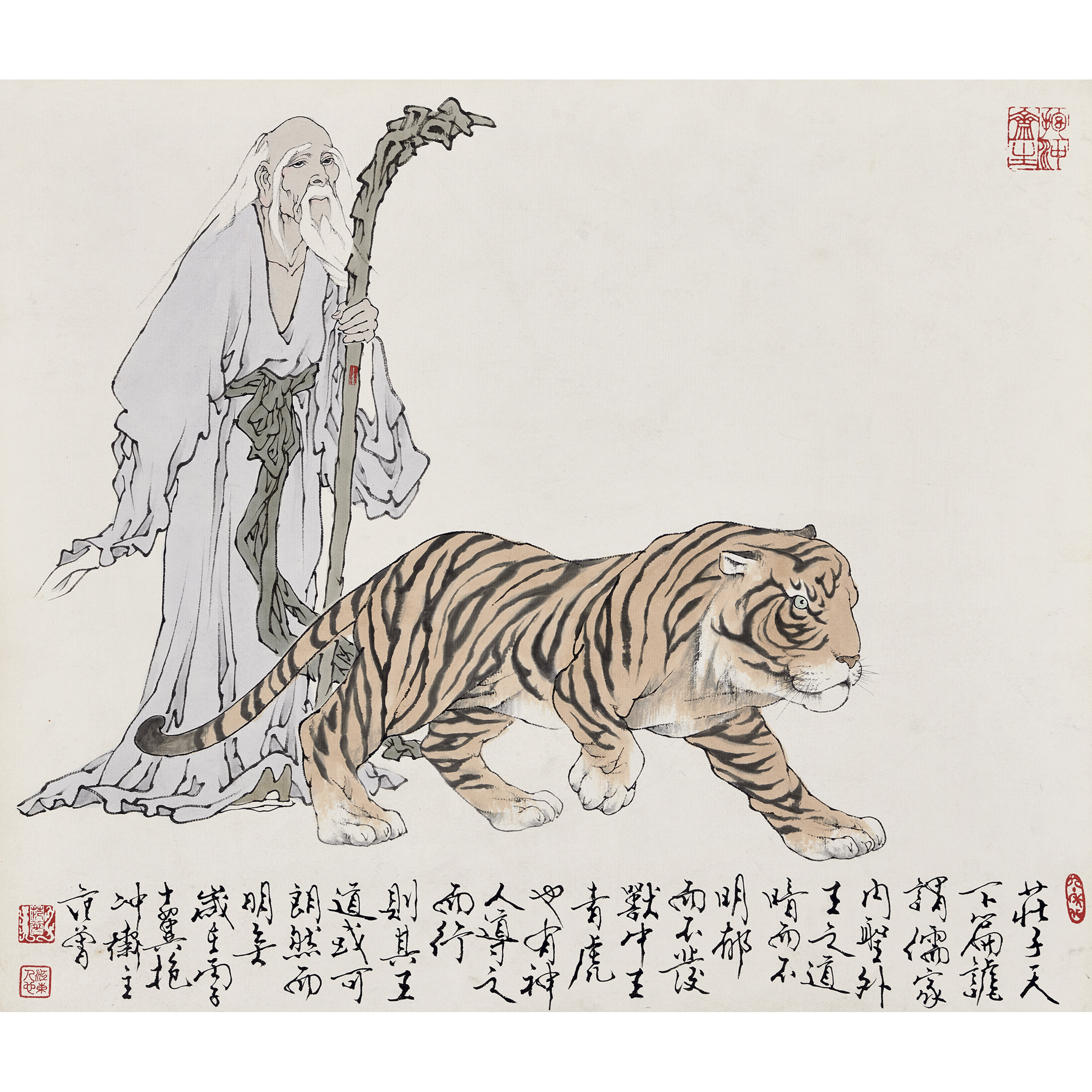 款識:莊子天下篇謔謂,儒家內聖外王之道,暗而不明,鬱而不發,獸中王青虎也,有神人導之而行,則其王道或可朗然而明矣。歲在丙子,十翼抱沖齋主范曾。