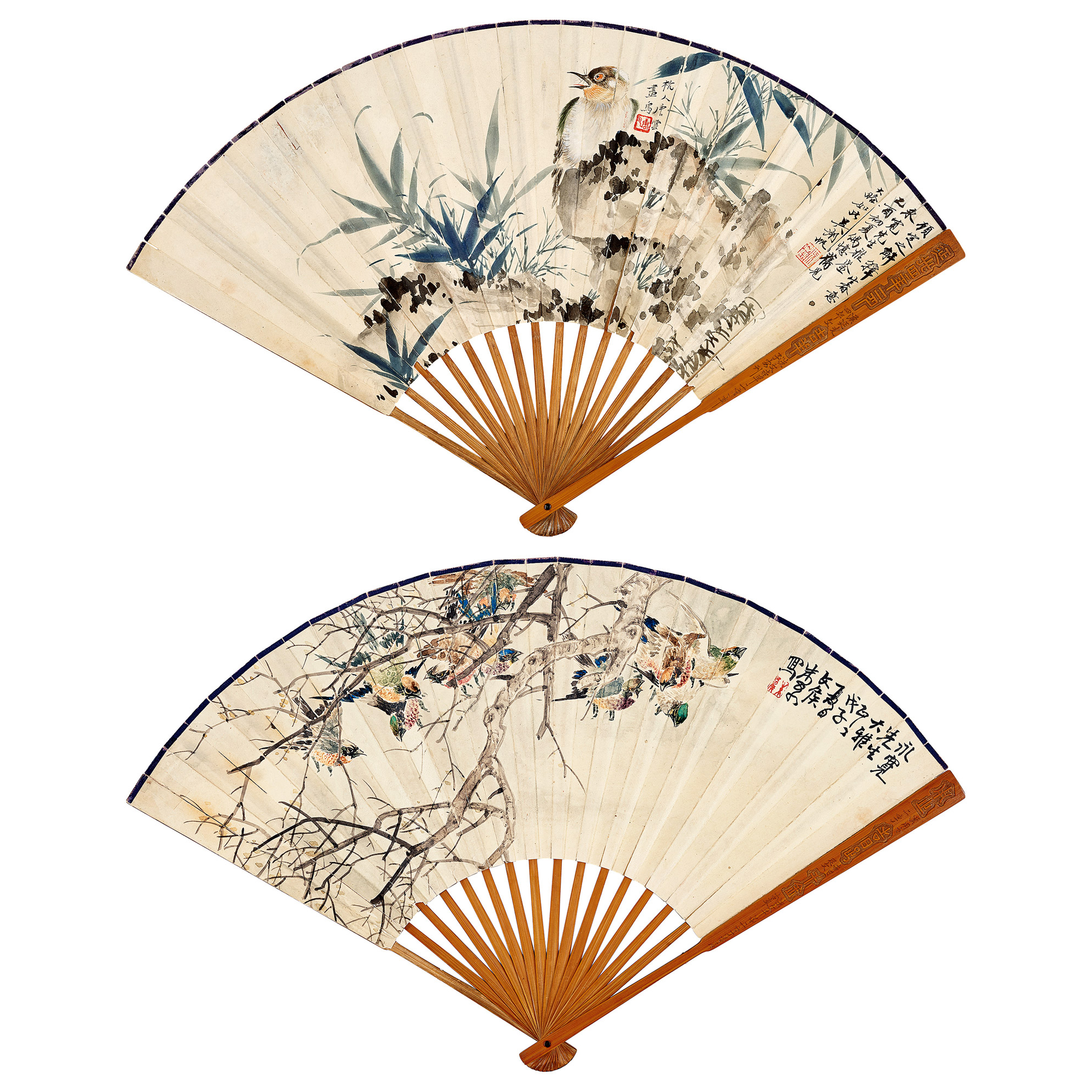 書:顧定之解籜生春意,永寬先生雅鑒,乙酉初夏,偶憶舊見大略如此,吳湖帆。杭人唐雲畫鳥。鈐印:吳湖帆(朱白)、唐雲(朱)
