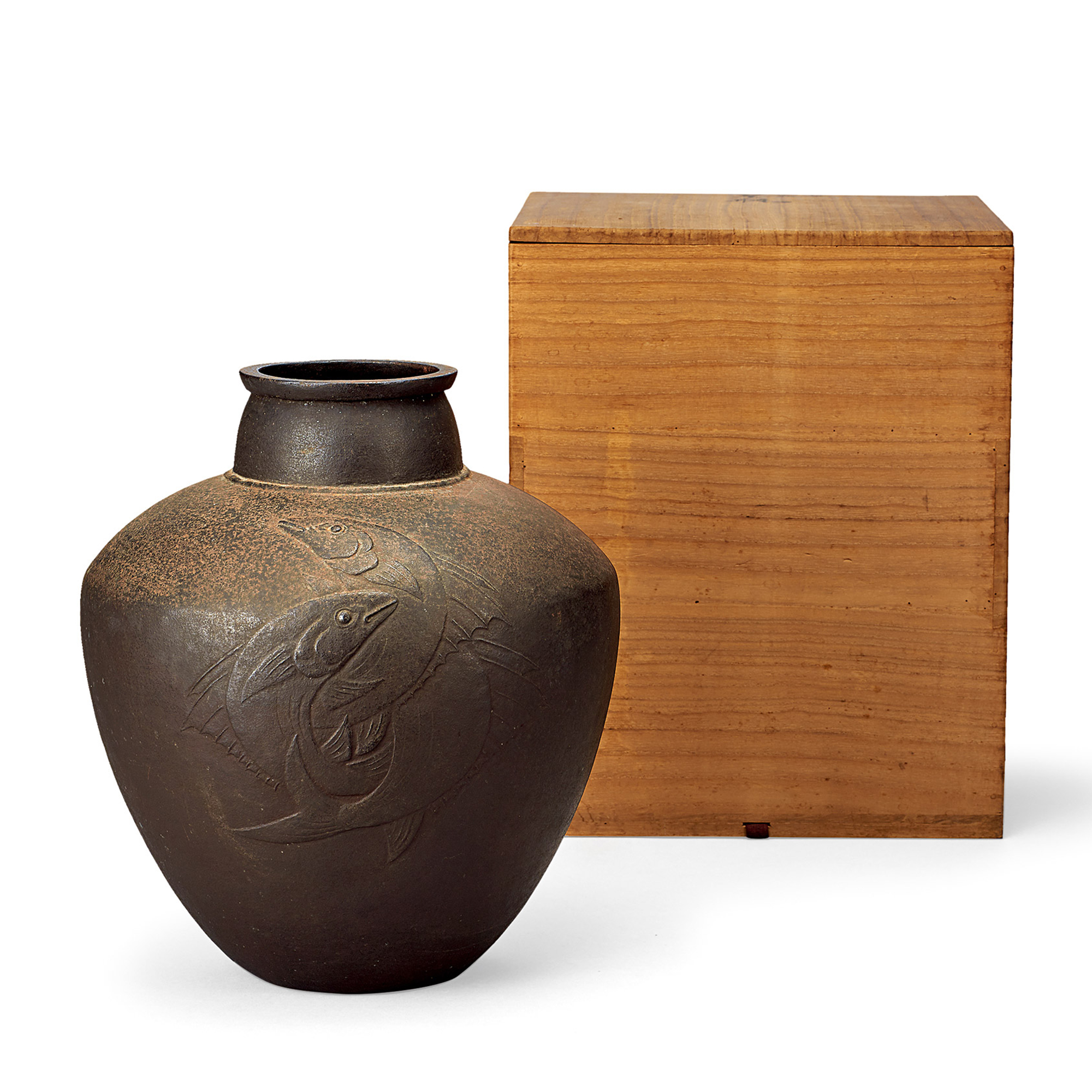 黑瀨宗世 鐵打出雙魚紋花瓶(付共箱)