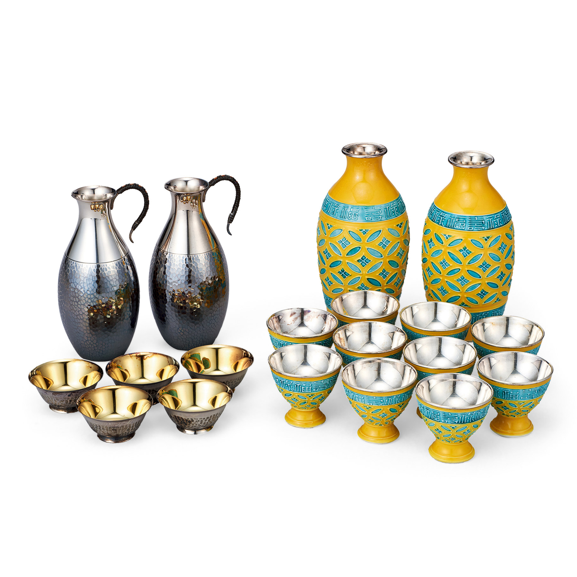 純銀鎚目紋酒器一套 生駒製純銀內貼永樂福祿壽圖酒器一套