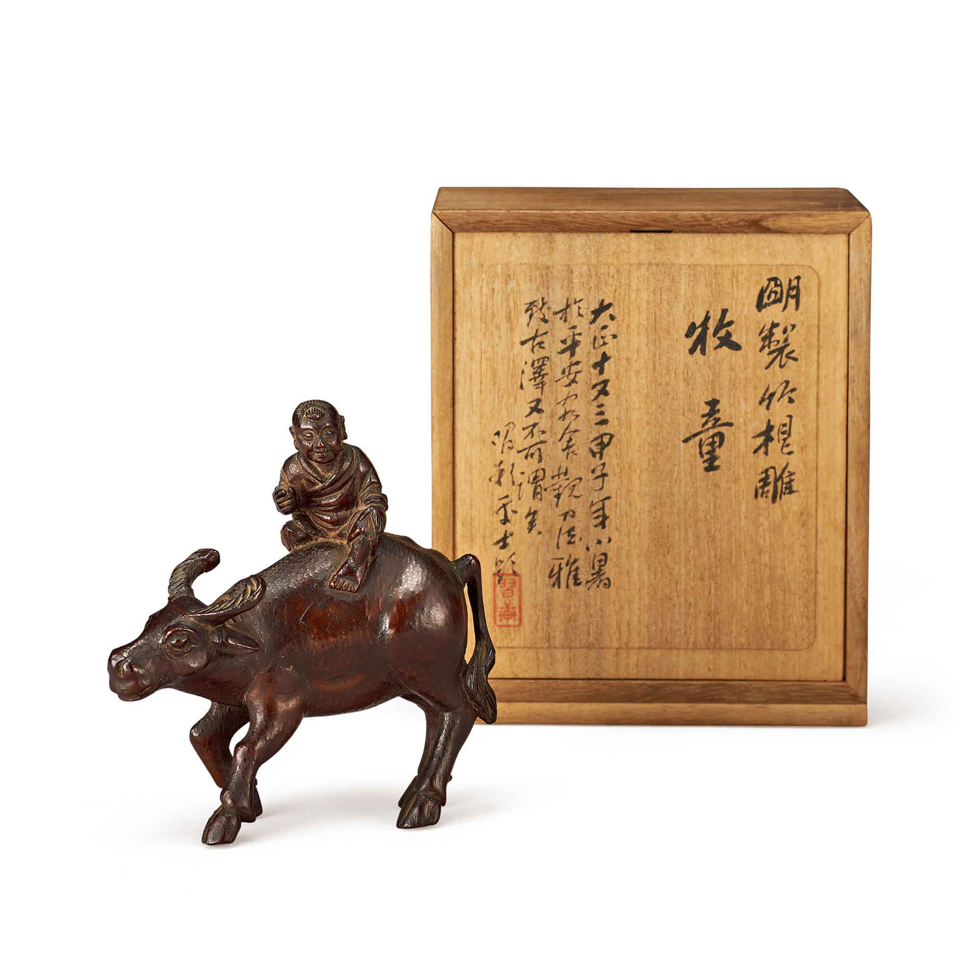 箱款:明製竹根雕牧童 大正十又三甲子年小暑於平安客舍觀刀法雅致古澤又不可謂矣 習士題