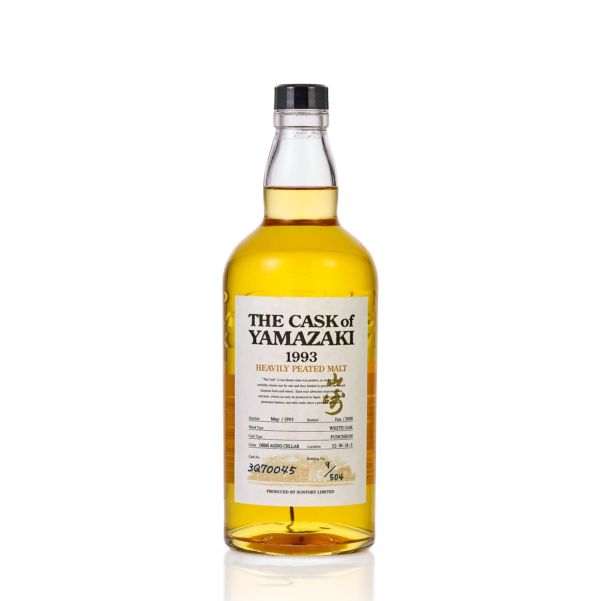 山崎原廠蒸餾裝瓶,於1993年5月蒸餾,於2008年6月裝瓶,限量504瓶,此瓶編號為9,白橡木桶,桶號:3Q70045。