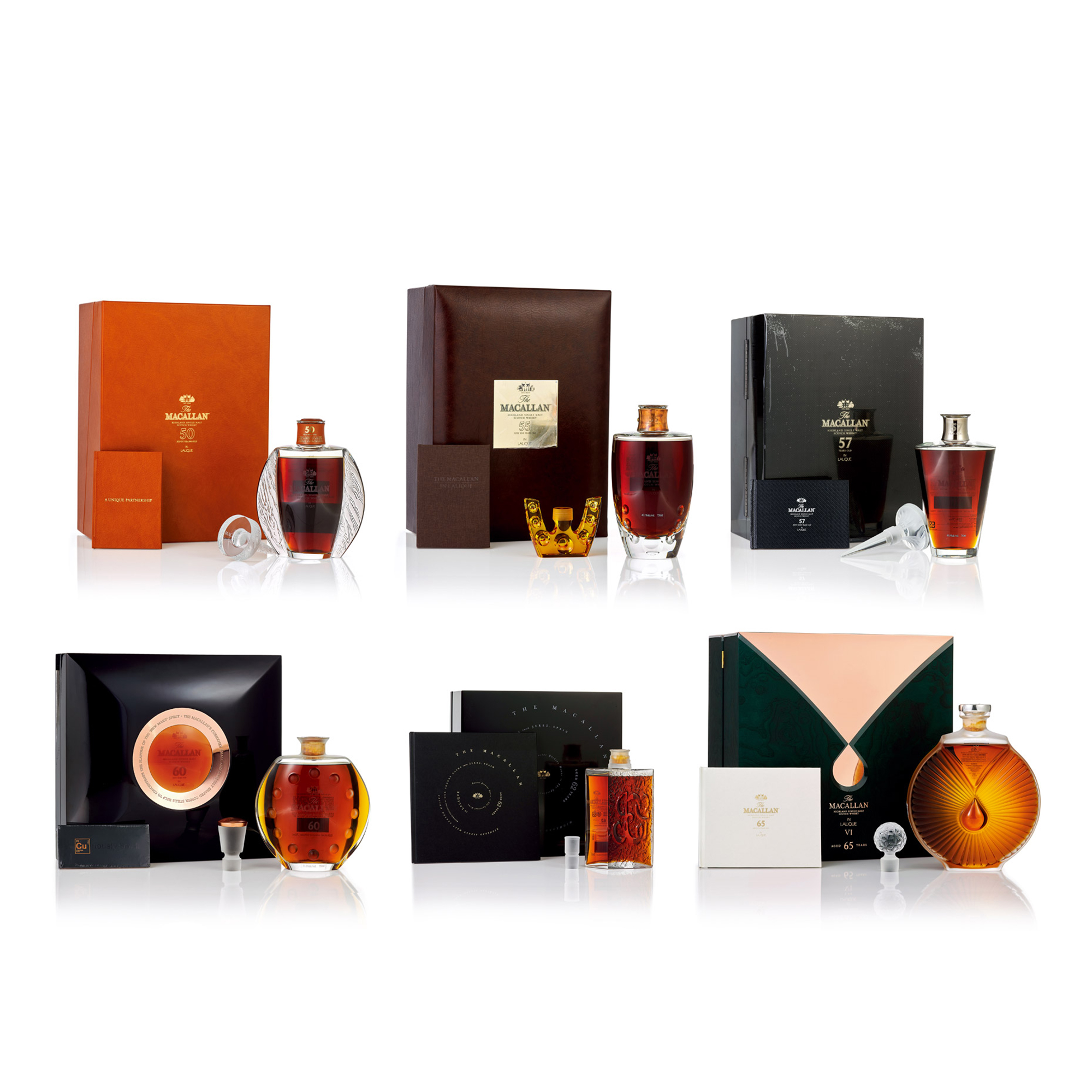 此系列中的第一支水晶瓶中裝有陳釀50年的單一麥芽威士忌,全球限量供應 470 瓶。 設計靈感源自於熟成麥卡倫威士忌的卓越橡木桶,注入萊儷標誌性的新藝術風格,創造出此臻品。系列中的第二瓶是裝有陳釀55年的單一麥芽威士忌,全球限量供應 420 瓶。此瓶的設計靈感來源於萊儷公司的Paquerettes Tiara 經典香水瓶,是在向 1910 年 Rene Lalique 的致敬。同時此瓶以漸層的琥珀色水晶製作,象徵著麥卡倫的天然色澤,其特殊造型的水晶瓶塞則體現了萊儷公司的傑出水晶工藝,其顏色也是燒製難度最大的水晶顏色。在第三瓶中,麥卡倫注入了57年陳釀的單一麥芽威士忌,其幾何造型瓶身充滿藝術感,最早在 2009 年推出此瓶,全球限量供應 400 瓶。此瓶是用來致敬追求卓越的麥卡倫人,將只取最精華的蒸餾酒心部分以呈現最佳品質。Satiné水晶瓶塞有著邊緣如絲似緞的透明設計,塞入瓶中其指向剛好於麥卡倫的最精華酒心部位,體現了其最優良的酒質。第四瓶在 2011 年推出,全球限量供應 400 瓶。瓶中注入了極為罕見的陳釀60年單一麥芽威士忌。瓶身設計仿照了麥卡倫小巧壺形蒸餾器的渾圓水壺造型。水晶瓶塞以把手形狀來設計,頭部使用了已退役蒸餾器的銅材進行裝飾,瓶身以半圓形的凸點設計一周,通過其盒子中的「天窗」可觀察橢圓形鉚釘,精巧用心。第五瓶在 2014 年推出,62 年的單一麥芽威士忌裝瓶在優雅的新藝術風格水晶瓶中,全球限量供應 400 瓶。這一瓶身造型靈感來源於麥卡倫的靈魂所在—伊斯特•艾爾奇莊園(Easter Elchies House)的玻璃形態化身。其長達數百年的歷史地位令麥卡倫以此為精神核心。同時將 Captain John Grant 的縮寫字母昂然蝕刻在水晶瓶正面以此致敬。第六瓶,也是本系列中的最終篇,於2016 年推出,全球限量供應 450 瓶, 65 年的單一麥芽威士忌是此系列中,也是當時麥卡倫所推出的年份最高,最為珍稀的酒款。其靈感源自於 Rene Lalique 傳承的藝術精神,以圍繞著一滴麥卡倫,象徵其極其珍貴的釀酒智慧,並延續了麥卡倫「無與倫比的釀酒精神」。