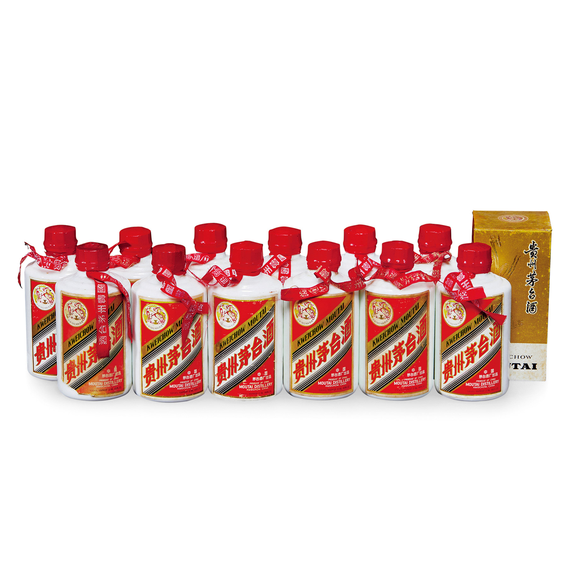 “飛天”商標,源於敦煌壁畫飛天形象,1958年後長期作為茅台酒廠出口專用。本標的共12瓶,均為140ml.量裝塑蓋“飛天”。