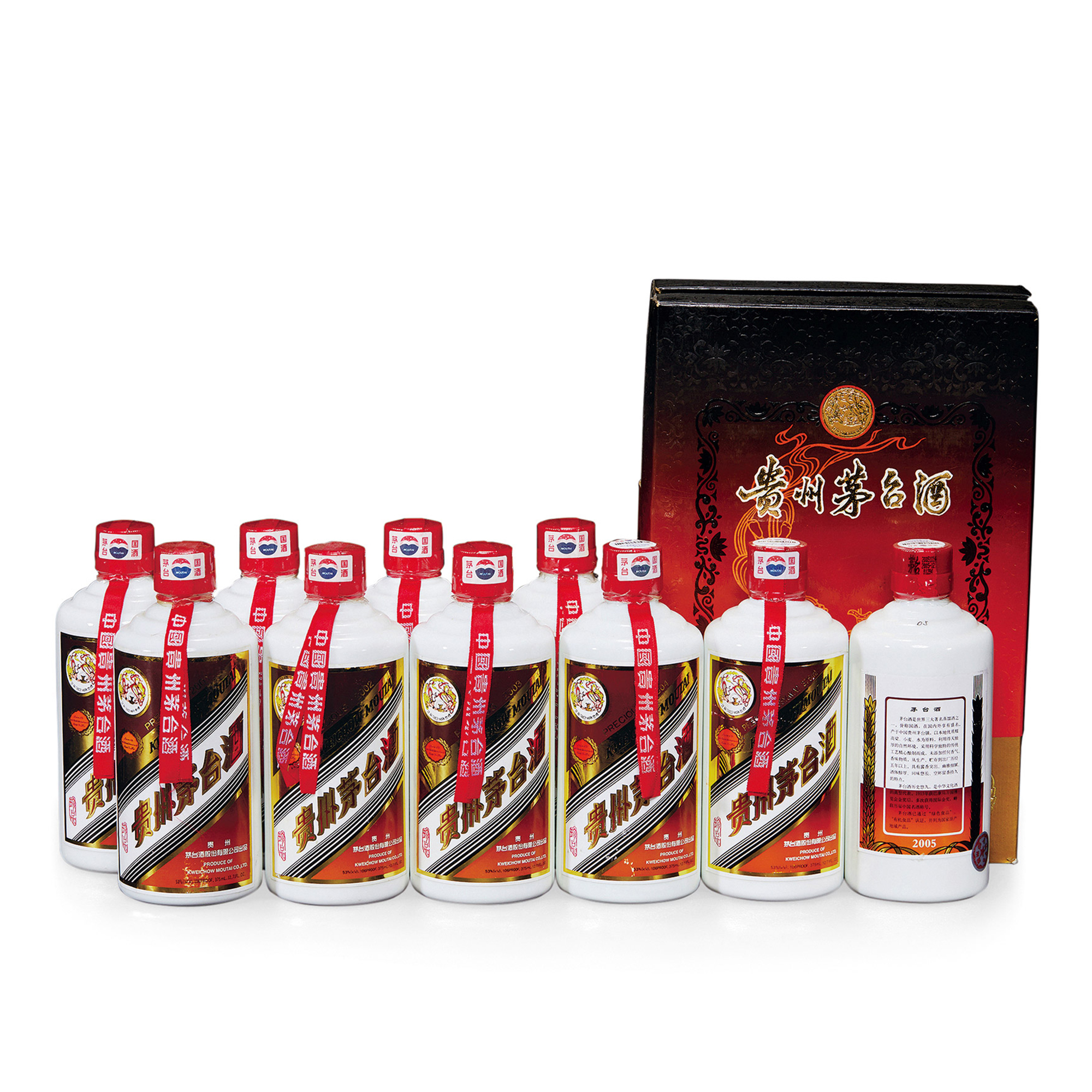 “飛天牌”豪華包裝“珍品”系列茅台酒是從1986年開始生產的高檔茅台酒,有紙質和木製兩種外包裝盒。此種珍品禮盒裝的茅台酒,是貴州茅台酒廠在推出年份酒之前的特殊優質酒。均是用窖存多年陳年老酒,精心勾兌而成、酒體醇厚豐滿、優雅細膩。本標的共10瓶,均為375ml.量裝飛天牌珍品茅台酒。