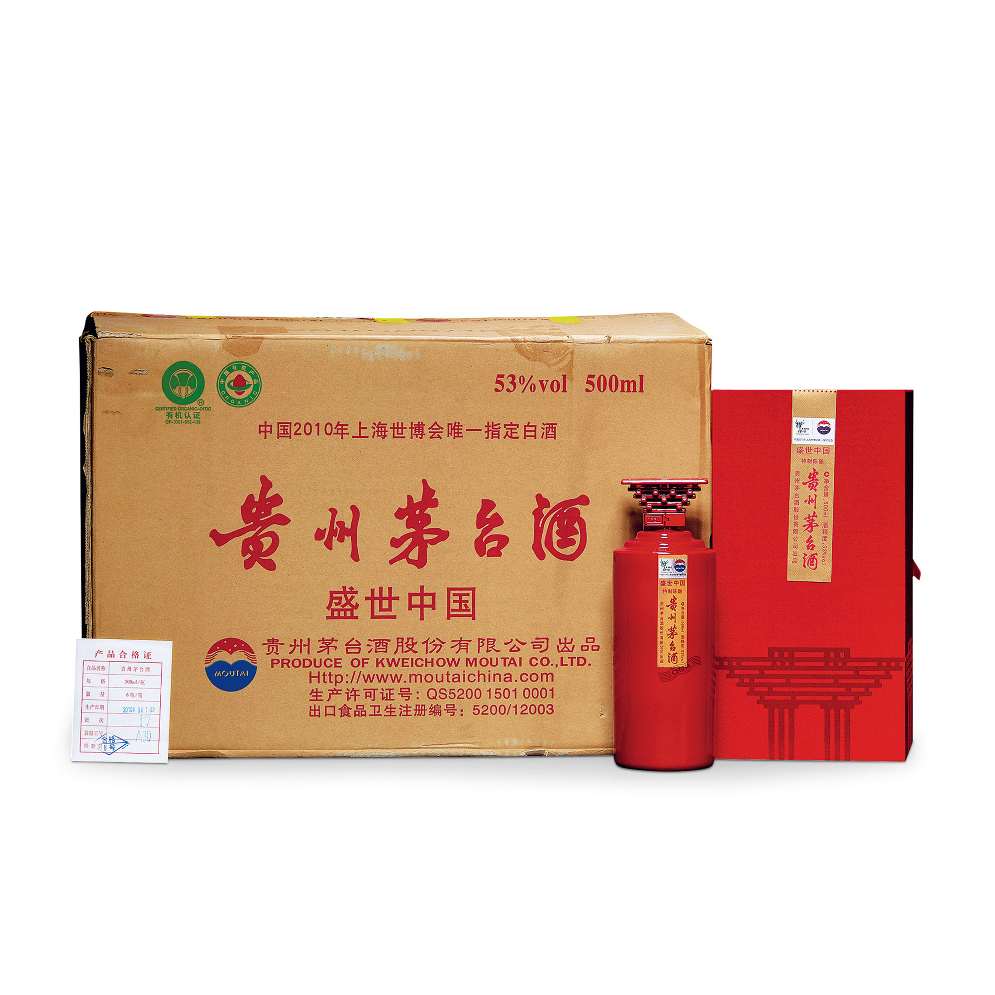 本標的為2010年產世博會紀念版貴州茅台酒盛世中國特製陳釀,《盛世中國》瓶身以中國國家館的造型特點精心設計,“東方之冠、鼎盛中華、天下糧倉、富庶百姓。”東方之冠與中國紅的完美組合,充分體現了中國文化的精神與氣質。《盛世中國》紀念特釀,限量出品16000樽,隨酒附贈中國郵政發行的歷屆世博會明信片,極具典藏與紀念意義。本標的為一箱6瓶裝。