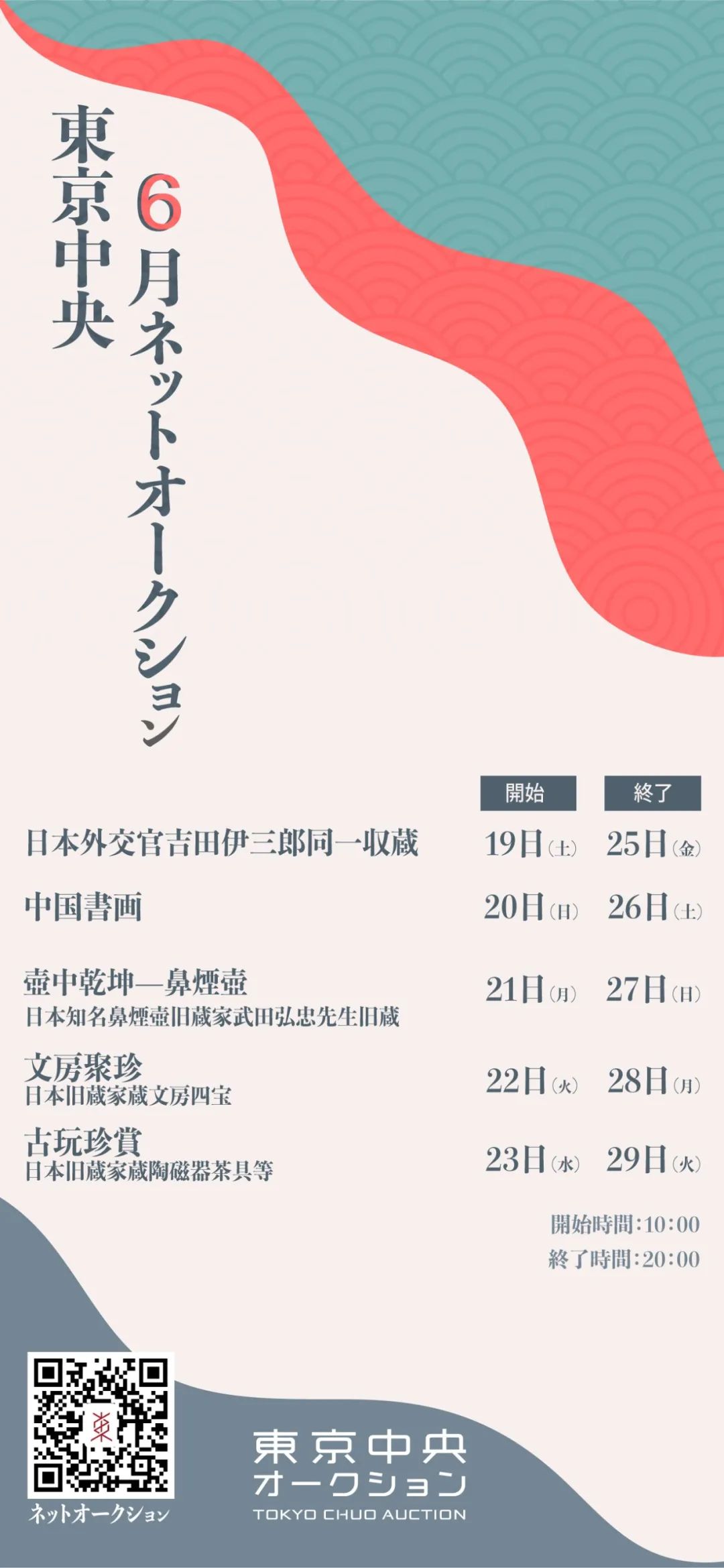東京中央オークションは6月19日(土)から期間限定ネットオークションを開催いたします。【日本外交官吉田伊三郎同一収蔵】、【中国書画】、【壺中乾坤——日本知名鼻煙壺旧蔵家武田弘忠先生旧蔵コレクション】、【文房聚珍——日本旧蔵家蔵文房四宝】、【古玩珍賞——日本旧蔵家蔵陶磁器茶具等】等のコレクションを出品しております。お心にかなう美術品をお気軽にご入札してください。
