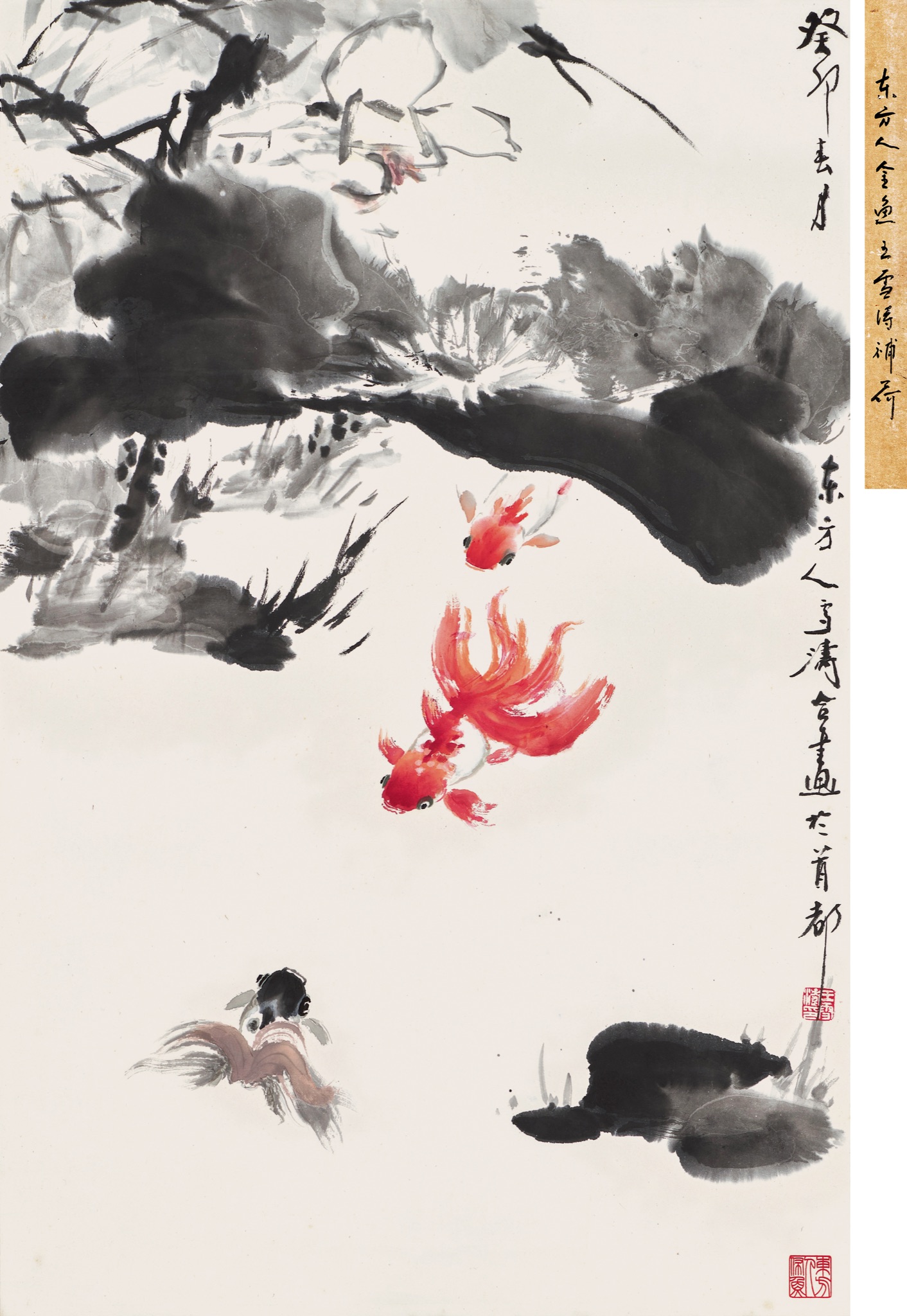 東方人は生涯を通じて、あらゆる魚をテーマにして描いていました。北宋時代の「没骨法」の技法を継承し、構図の固定観念にとらわれず、「異時同図法」、「対角線構図法」、「雲竜式」などの技法も追加することにより、静止している状態でも無限に広がる動きの多様性があります。今回のメインの作品である「蓮魚図」は彼の友人の王雪濤との合同作品です。東方人が魚を描き、王雪濤が蓮を描きました。王雪濤は花鳥などの作品を得意とする近代画家で、幅広い画材と緻密なアイデアで、豊かな表現力が魅力です。