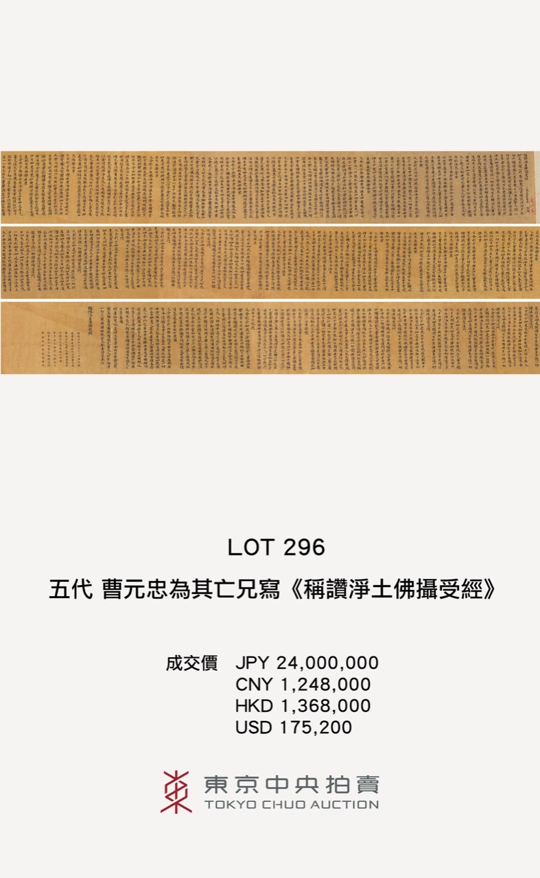 此次領跑的 Lot 296 五代 曹元忠為其亡兄寫《稱讚淨土佛攝受經》是大乘佛教經典之一,系玄奘法師(602—664)於唐高宗永徽元年(650)據梵本翻譯。此次東京中央拍賣所隆重呈現此卷「曹元忠為其亡兄寫《稱讚淨土佛攝受經》」,全卷首尾完整,每紙均為28行,每行16至17字,規制嚴整。如此完好無缺的傳世唐人寫經長卷,且單部經首尾具足,極為稀見。