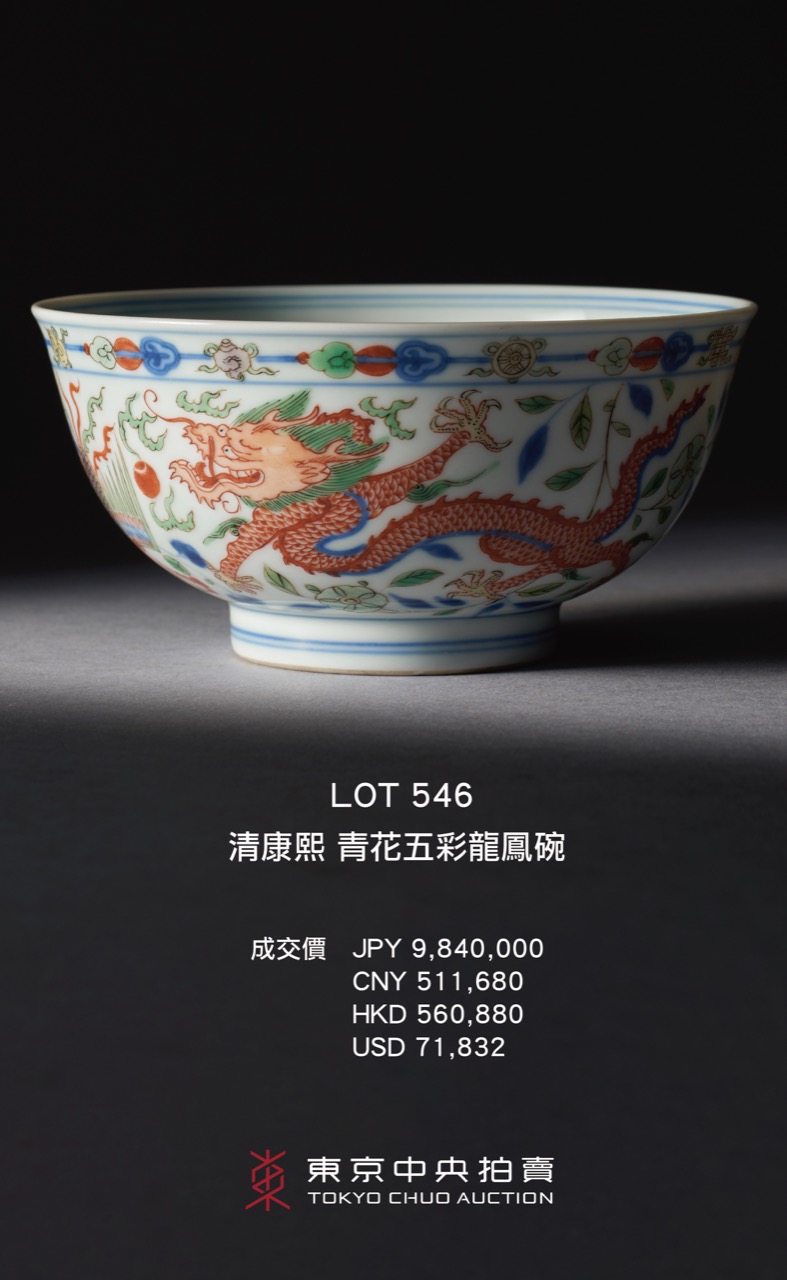 瓷器拍賣亦成績驕人。Lot 554 清嘉慶 青花饕餮蕉葉紋三足香爐亦以逾一千四百萬日元成交,摘瓷器類別桂冠。明星拍品Lot 546 清康熙 青花五彩龍鳳碗亦以逾九百八十萬日元成交,成績斐然。此次明星拍品眾多,詳見文末精選。