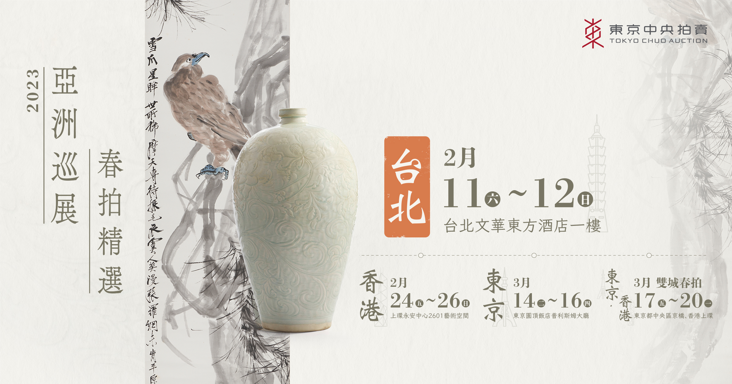 東京中央拍賣將於今個初春隆重呈獻「東京中央亞洲巡展:2023年春拍精選」,巡展首站將於2月11至12日在台北文華東方酒店舉行,展示逾百件名瓷重器、名家書畫等,其後於香港及東京接力展出,歡迎各位親臨觀展,一睹珍品風采。即搶先看精選拍品!