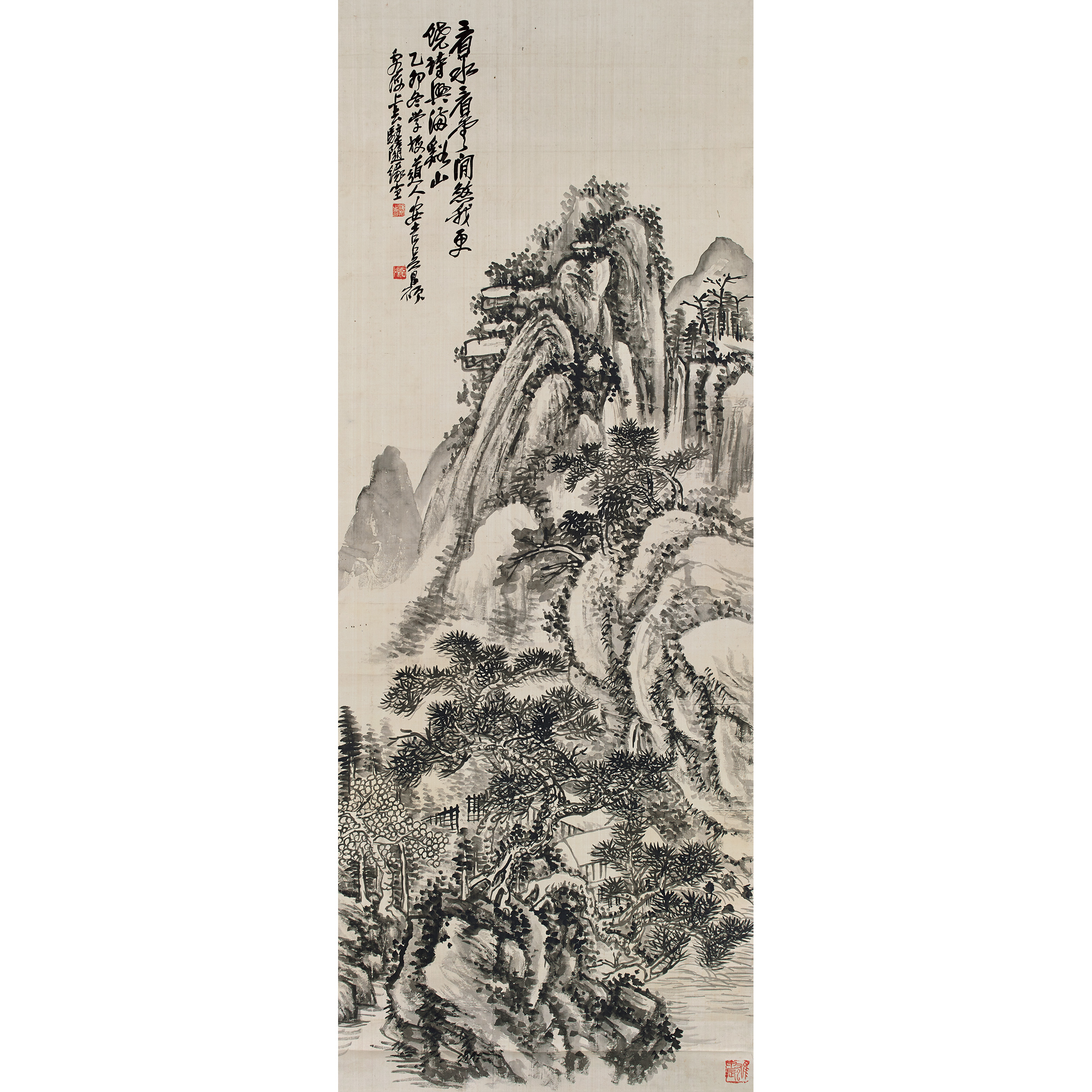 說明:是幅山水絹本立軸,大幅繪夏山逸興之景,並綴以長題。筆力扛鼎,水墨蒼莽,大氣磅礡,詩、書、畫、印融為一體,為吳昌碩晚年的扛鼎之作。圖中峻峰高聳,丘壑縱橫,山石嶙峋,古木叢叢,山下溪水縈繞,蒼松掩映之處,見茅屋數椽,表現出幽居隱逸之景。吳昌碩的繪畫以花鳥見長,而水墨山水卻不易見,有「花卉三千,山水不過數十」之說。縱觀整幅畫作,筆墨老辣縱橫,淋灕頓挫,氣象蒼茫渾厚,意境超逸豪邁,格韻高古,動人心魄,實為缶翁難得的山水力作。吳昌碩學畫初從趙之謙,又師任伯年,博取石濤、八大、陳淳、徐渭等諸家之長,兼收並蓄,晚年以金石入畫,而成自家風貌,一洗晚清畫壇之沈寂頹味,為近代書畫開創新局面。步入晚年後,缶翁偶作山水,曾自言「金石第一,書法第二,花會第三,山水外行」,實屬自謙。其壯年時曾攜八幅得意山水請其師楊峴品鑒,楊峴便題詩贊道:「樹借濕筆點,山憑幹墨皴。不知勢遠近,但覺氣嶙峋。張壁駭風雨,滿堂朝鬼神。陸癡與嚴怪,浩蕩幾時馴。」將其與元代山水畫家黃子久、清代山水畫家嚴滄酷相模擬,足見對其山水畫作評價之高。是幅畫作於乙卯1915年,缶翁步入古稀之年,雖早已是名滿天下的一代宗師,仍以耕耘筆墨作為日課,常摹各家筆法,博取眾長,樂之不疲。同年作一幅《仿石濤山水》,曾自題:「臨石濤巨幀,三日竟事」,可知對習畫之事仍然傾註極大精力。勤勉如此,筆力自是有增無減,臻至妙境。此畫上題識「學梅道人」,觀之是作,既得吳仲圭蒼莽雄厚之風,行筆又如急風驟雨,恣肆雄健。點染從容,潤中帶燥,以氣勢勝。細觀其山石林木之點劃勾勒,以中鋒落筆,兼收篆隸狂草之筆意,看似隨心所欲,卻飽含金石之氣,可謂自辟蹊徑,獨標風骨。此畫落款中見「去駐隨緣室」,頗有來歷。吳昌碩一生齋名室號眾多,1887年初到上海,借居王綬山浦東舊寓,前途未明,心下惶恐,故題齋匾「去住且隨緣室」。直到1911年再次「橐筆至滬」時,舉家定居上海石庫門住宅,才題匾為「去駐隨緣室」,以紀情歸滬上之心。此齋名隨後一直沿用至逝世,亦由此得見缶翁「道所在而緣亦隨之」的心跡。