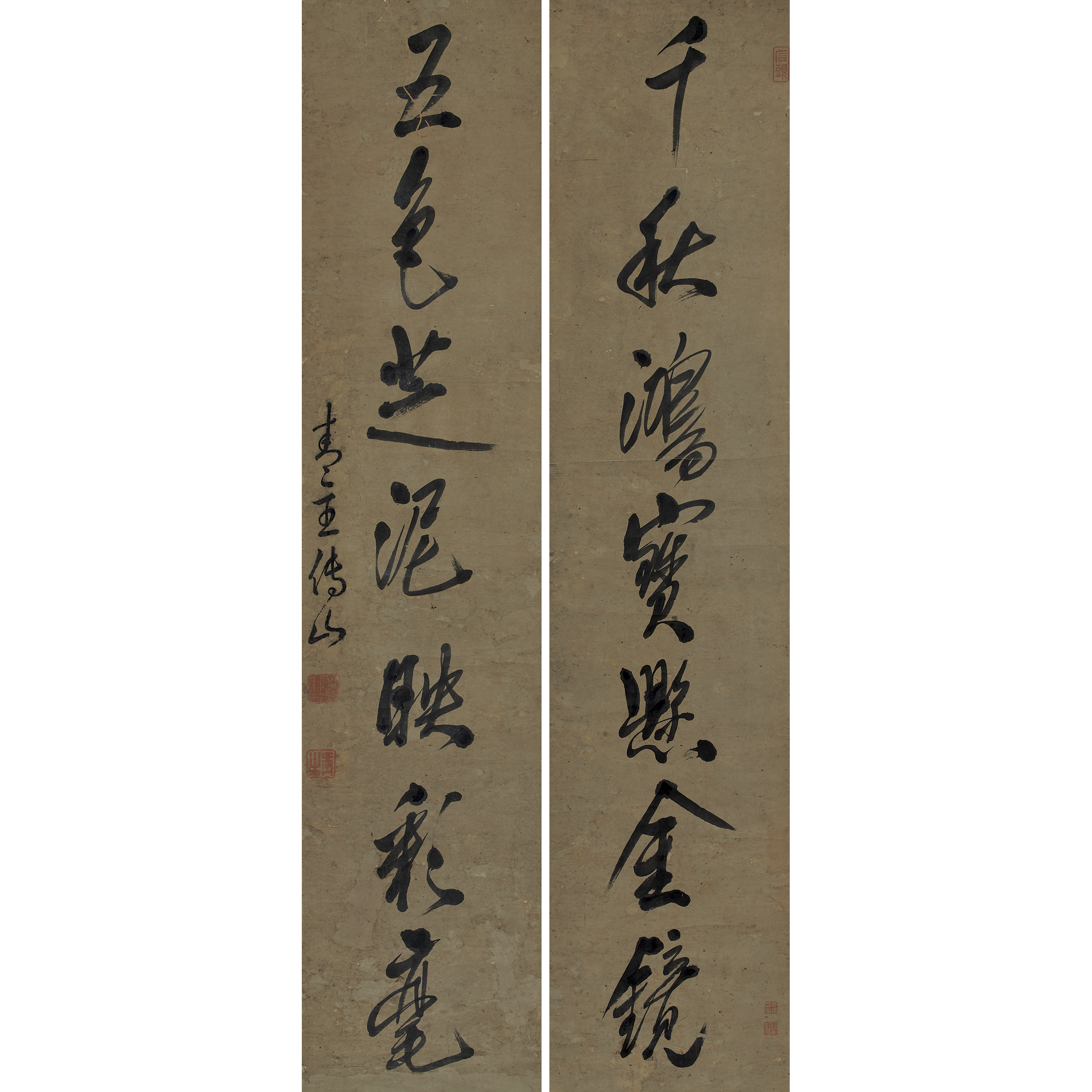 釋文:千秋鴻寶懸金鏡,五色芝泥映彩毫。注:附文物商店標籤。作者簡介:傅山 字青竹,後改字青主,陽曲(今山西省太原市尖草坪區向陽鎮西村)人,別號公它、公之它、朱衣道人等。著名全能學者,哲學、醫學、儒學、佛學、詩歌、書法、繪畫、金石、武術、考據等無所不通。