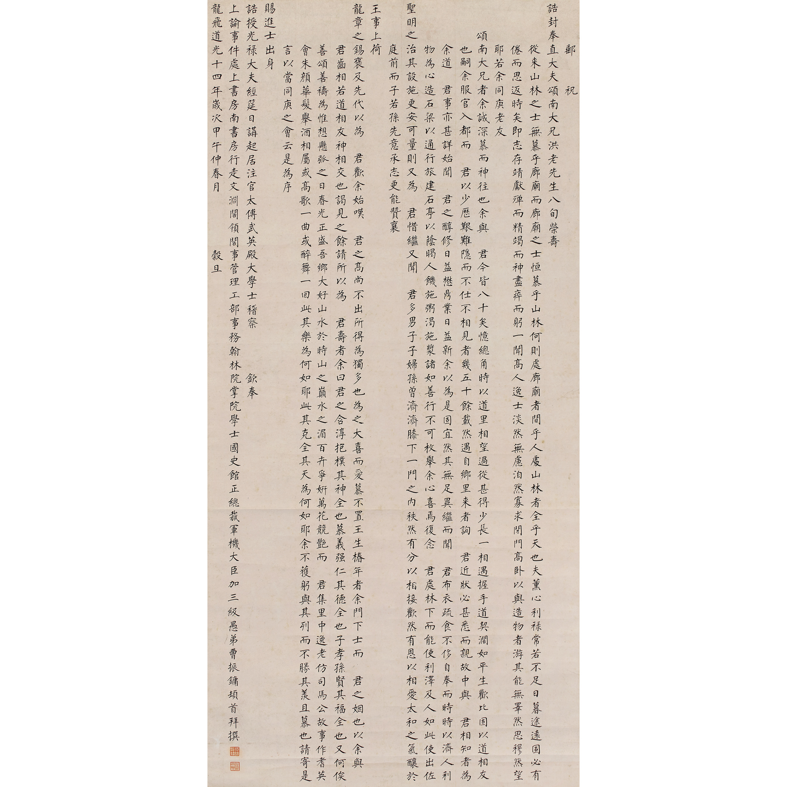 款識:賜進士出身,誥授光祿大夫經筵日講起居注官太傅武英殿大學士稽察上諭事件處,上書房南書房行走文淵閣領閣事管理工部事務翰林院掌院學士國史館正總裁軍機大臣加三級,愚弟曹振鏞頓首拜撰。龍飛道光十四年歲次甲午仲春月。