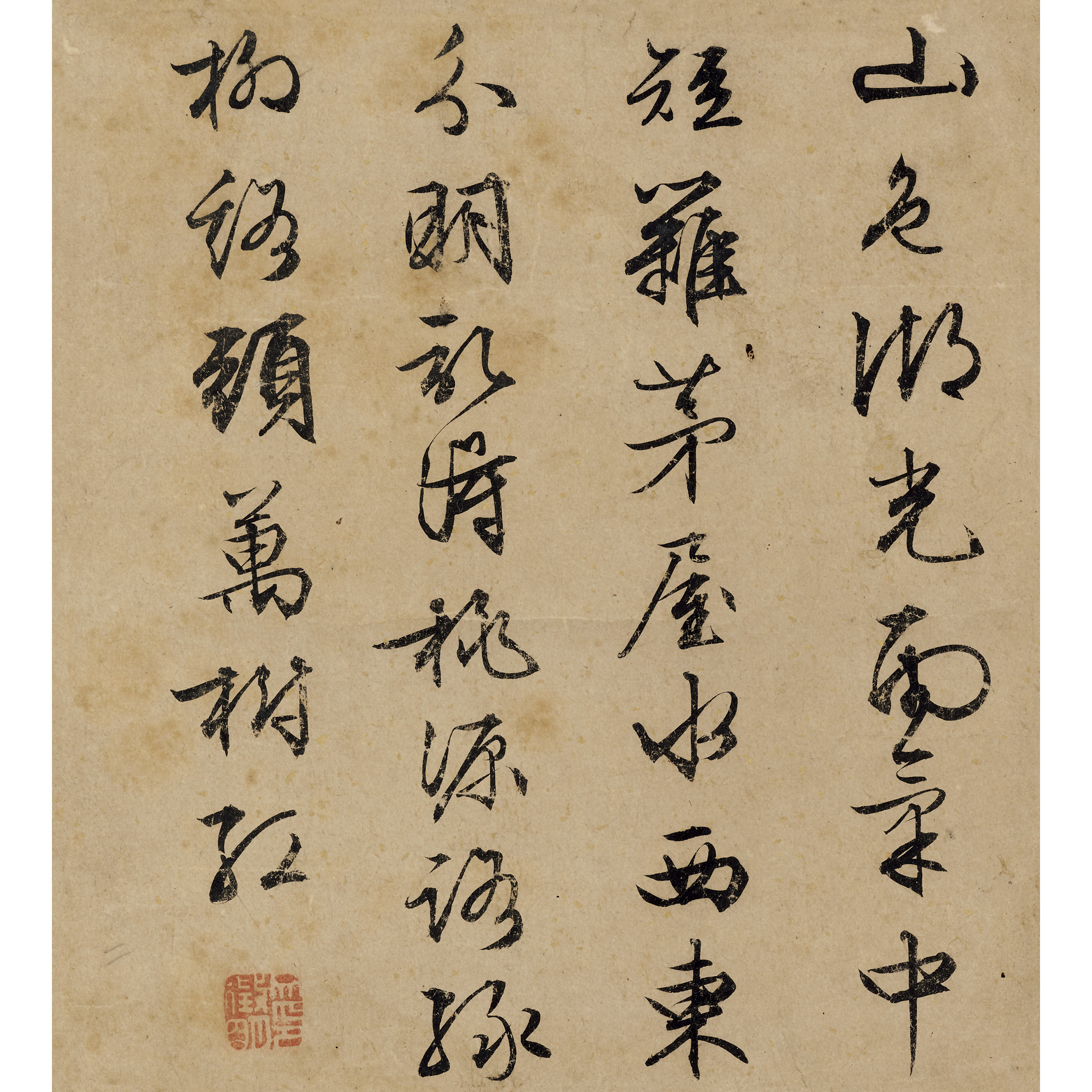 釋文:山色湖光雨氣中,短籬茅屋水西東,分明記得桃源路,綠樹谿頭萬樹紅。