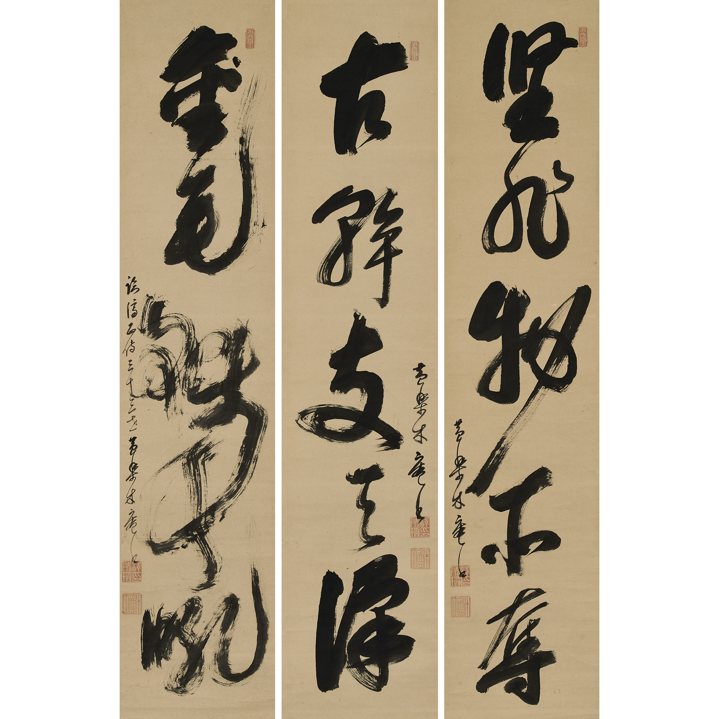 ②金毛聲吼。臨濟正傳三十三世黃檗木庵書。鈐印:釋戒瑫印(白)、木盦氏(朱)、方外學士(白)