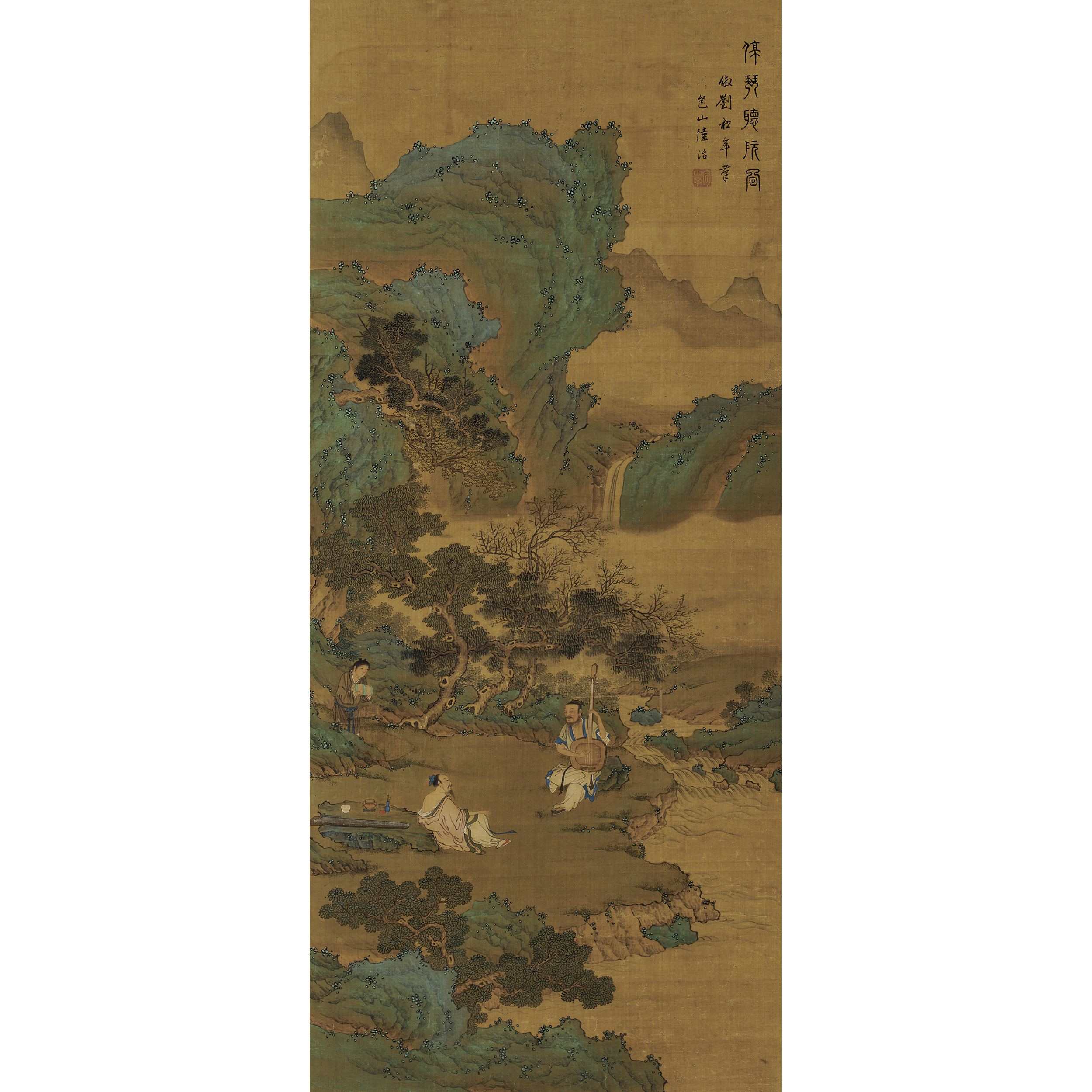 款識:停琴聽阮圖。仿劉松年筆,包山陸治。