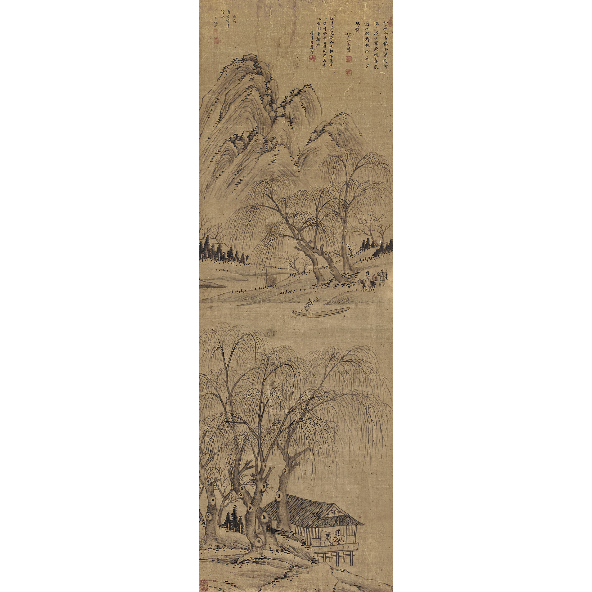 ①知君高古悵年華,楊柳依依處士家,故國春風愁入眼,野航時泛夕陽斜。鳩江王賢。鈐印:王賢(白)、詩瘦(朱)