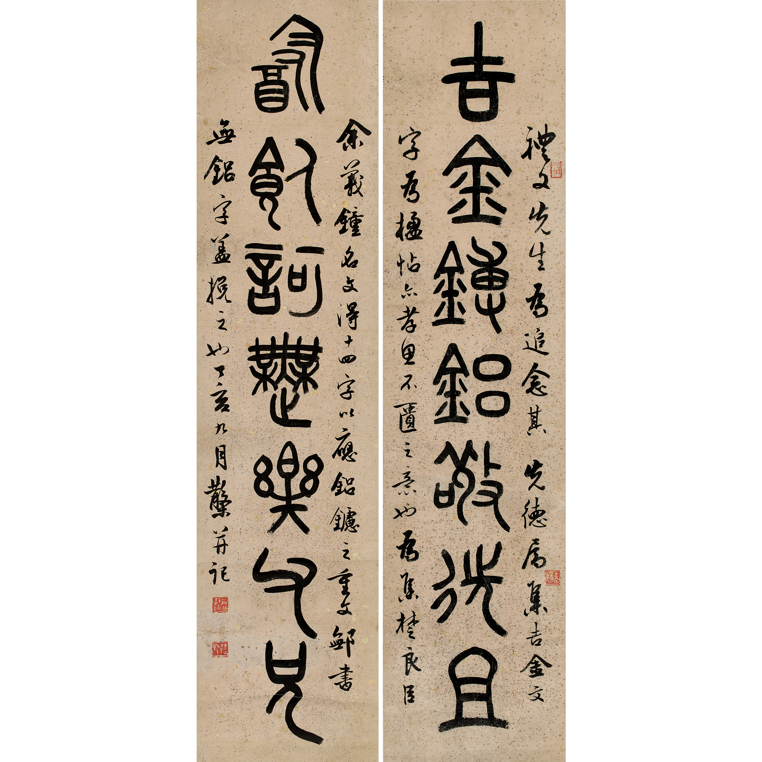 款識:禮文先生為追念其先德,屬集吉金文字為楹帖,亦孝思不匱之意也,為集楚良臣,余義鐘名文,得十四字,以應鋁鑢之重文,鄦書無鋁字,蓋輓之也。丁亥九月,散木並記。