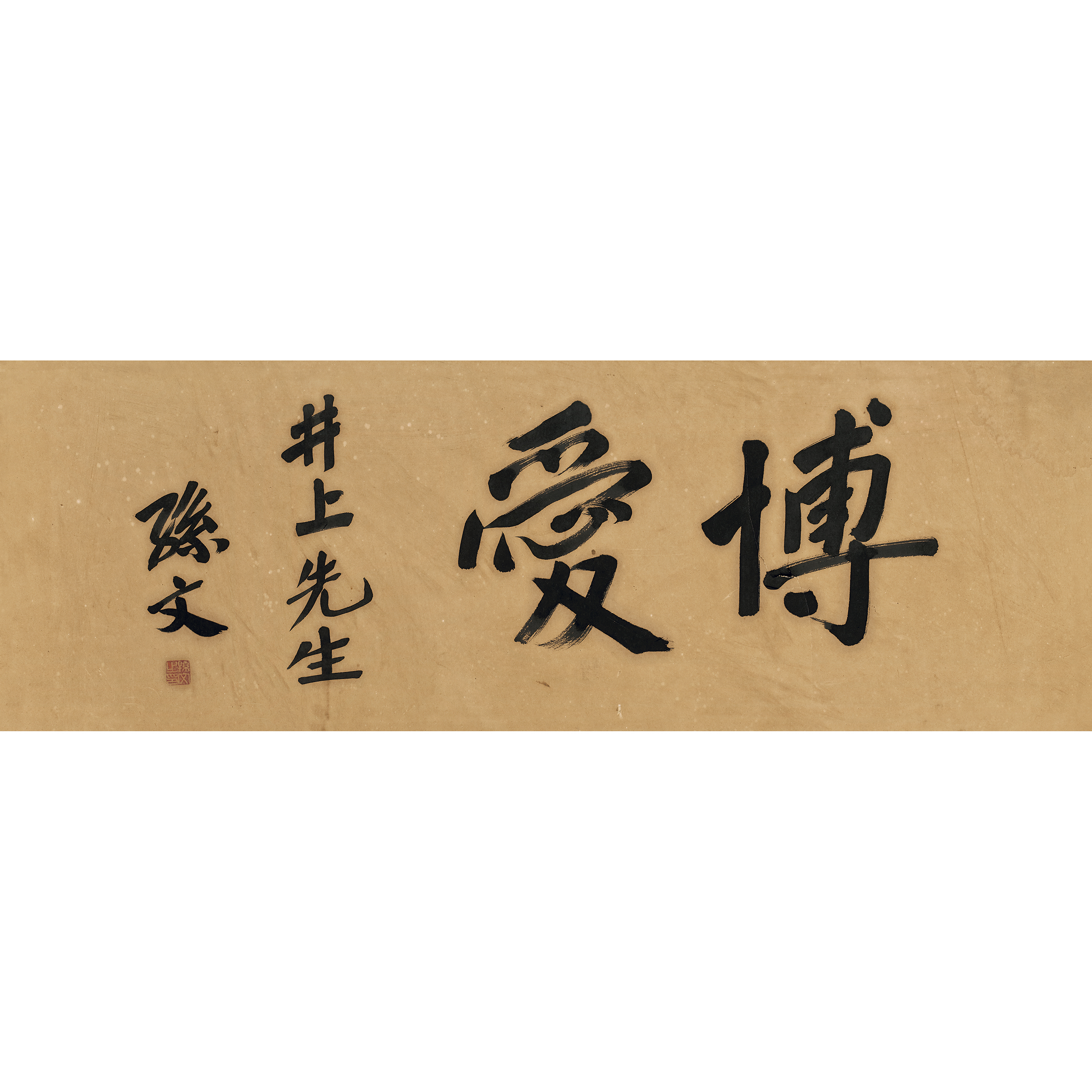 說明:「井上先生」乃青島天籟洞井上家井上源太。井上源太氏為上世紀初期著名的中國美術品收藏家,其收藏範圍廣泛,如中國書畫、文房四寶、佛像古玩。不但是當時有名的藏家,更是著名的文房研究家,發表過不少研究文章,亦曾將其研究著作付梓。井上先生所藏道釋題材的藏品尤為精。井上先生平生篤信佛法,作為西日本高野山(高僧空海開創真言宗之地)一區的信者代表,曾為修繕此處被大火燒失的遍照尊院,而將自己所藏的書畫、文房四寶捐出,與遍照尊院目黑隆見住持一同籌集經費,因而有了昭和十(1935)年所舉行的《高野山遍照尊院目黑師、青島天籟洞井上家藏品入札》,此二人的無私之舉,令信眾承佛澤之功德,備受傳頌。孫中山先生平生最愛書“博愛”二字,凝集了其高遠的政治理想和高尚的道德情操,今見此二字贈予井上先生,最適合不過了。