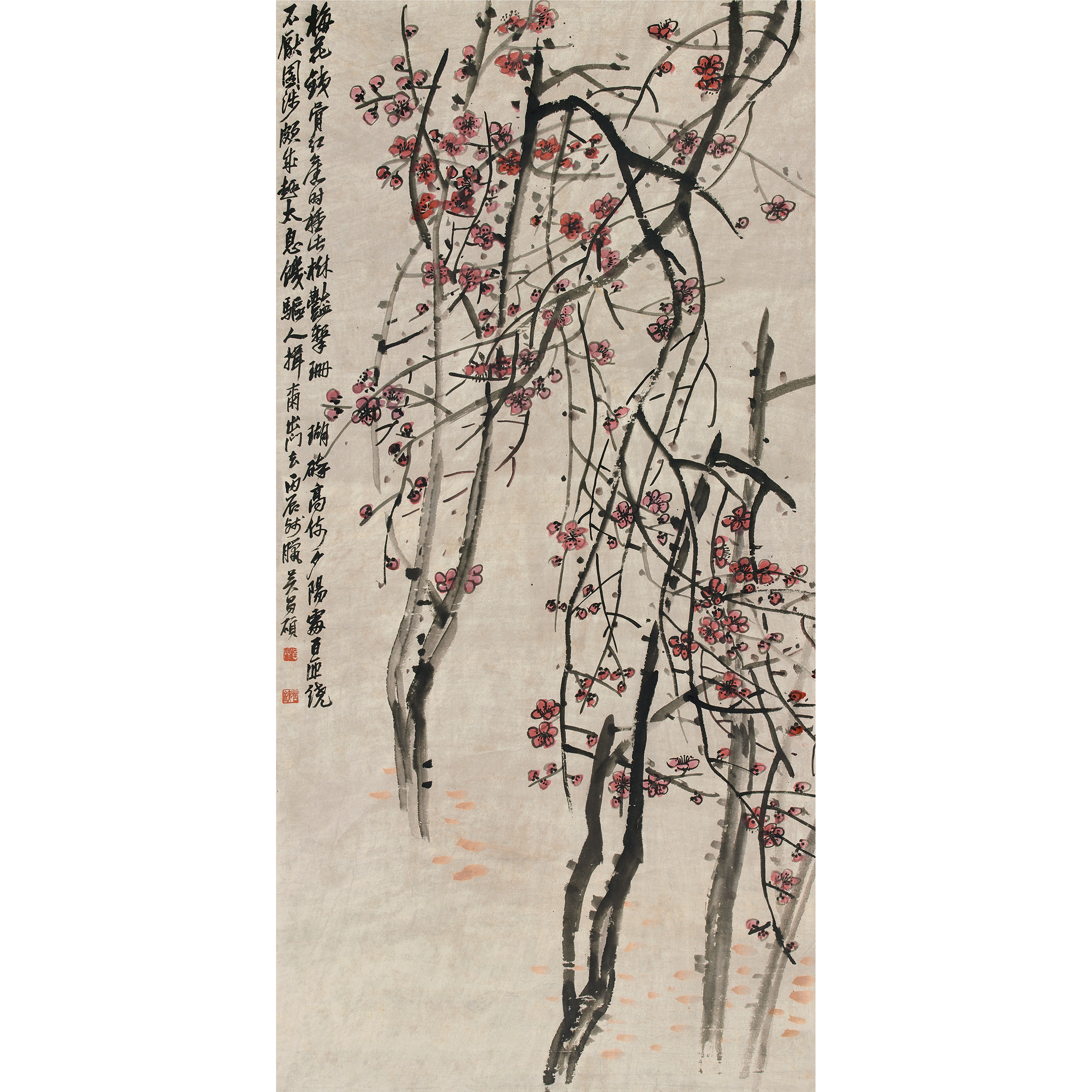 款識:梅花鐵骨紅,舊時種此樹,豔擊珊瑚碎,高倚夕陽處,百匝繞不厭,園涉頗成趣,太息饑驅人,揖爾出門去。丙辰殘臘吳昌碩。