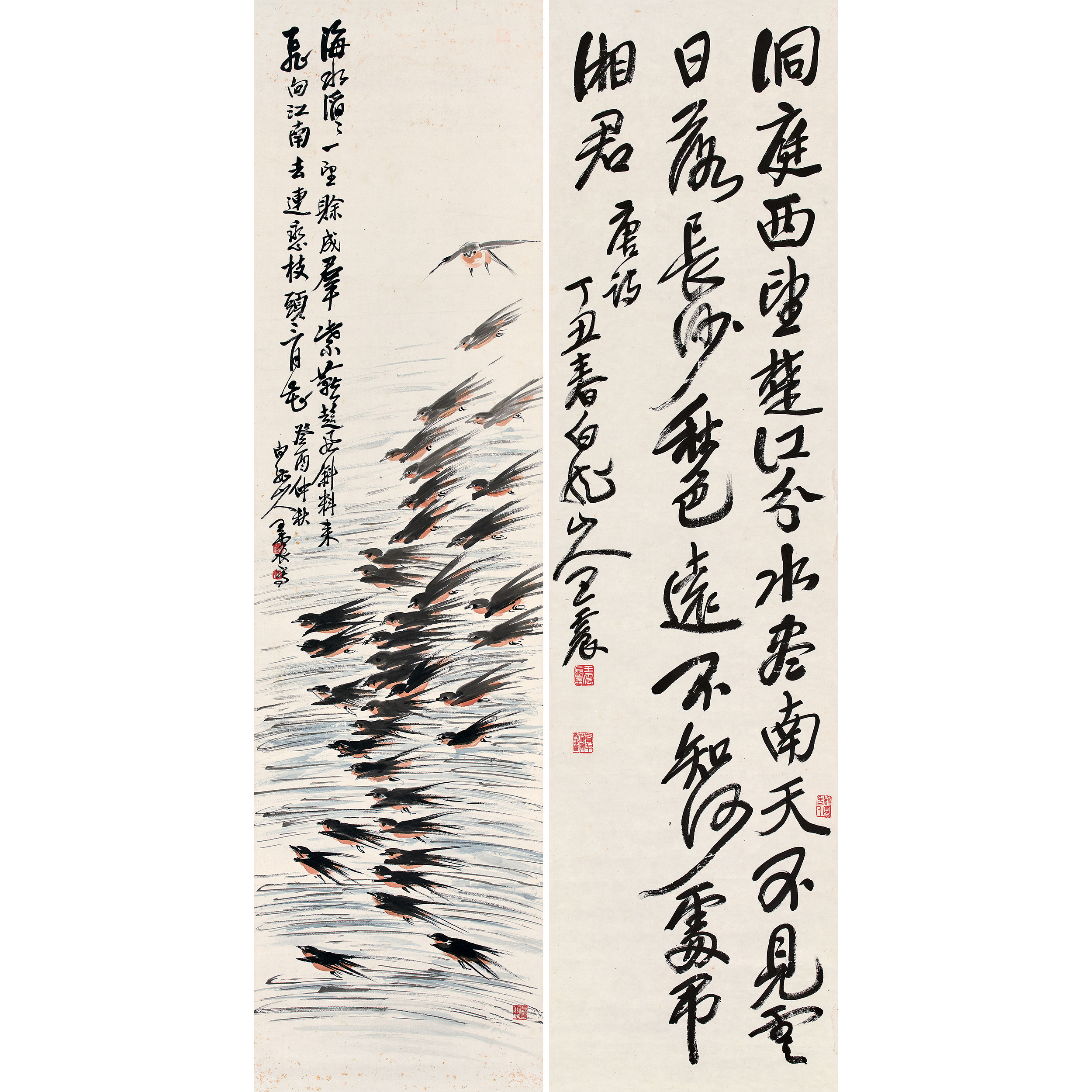 [畫]款識:海水滔滔一望賒,成群紫燕趁風斜,料來飛向江南去,連憨枝頭三月花。癸酉仲秋,白龍山人王震寫。