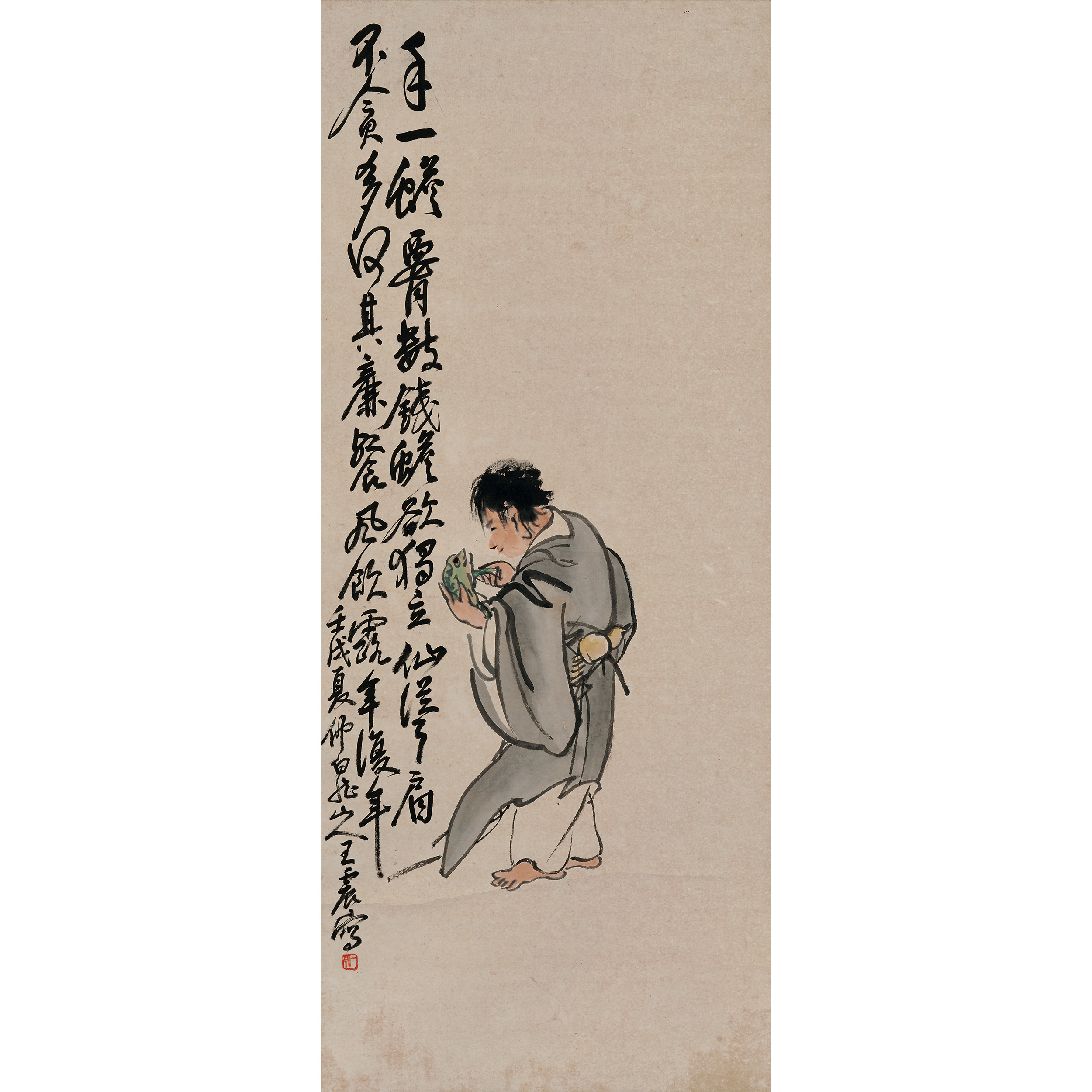 款識:手一蟾,腰數錢,蟾欲獨立仙聳肩,不貪多,何其廉,餐風飲露年復年。壬戌夏仲,白龍山人王震寫。