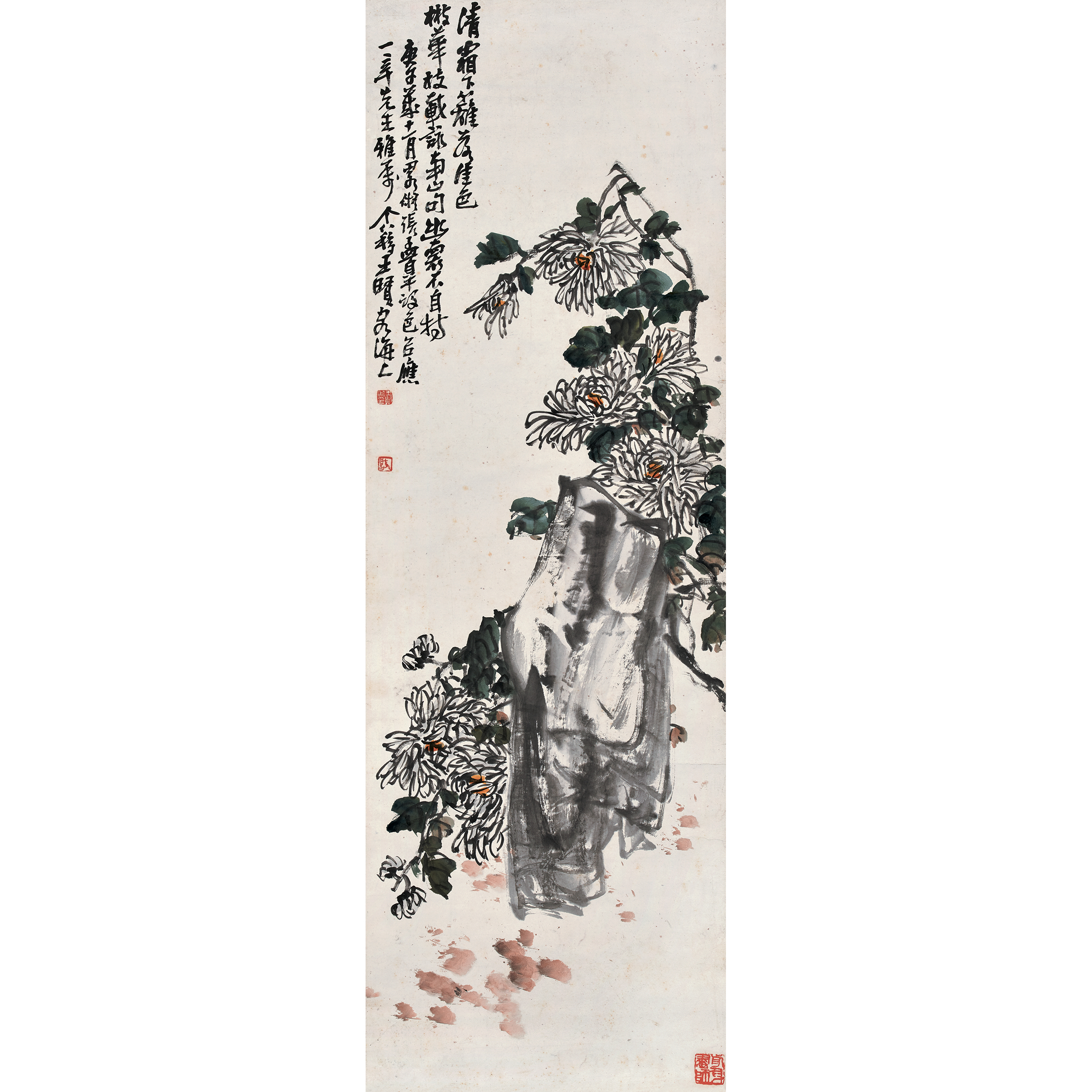款識:清霜下籬落,佳色散華枝,載詠南山句,幽懷不自持。庚子歲十一月,略擬張孟自平設色,以應一辛先生雅屬。个簃王賢客海上。