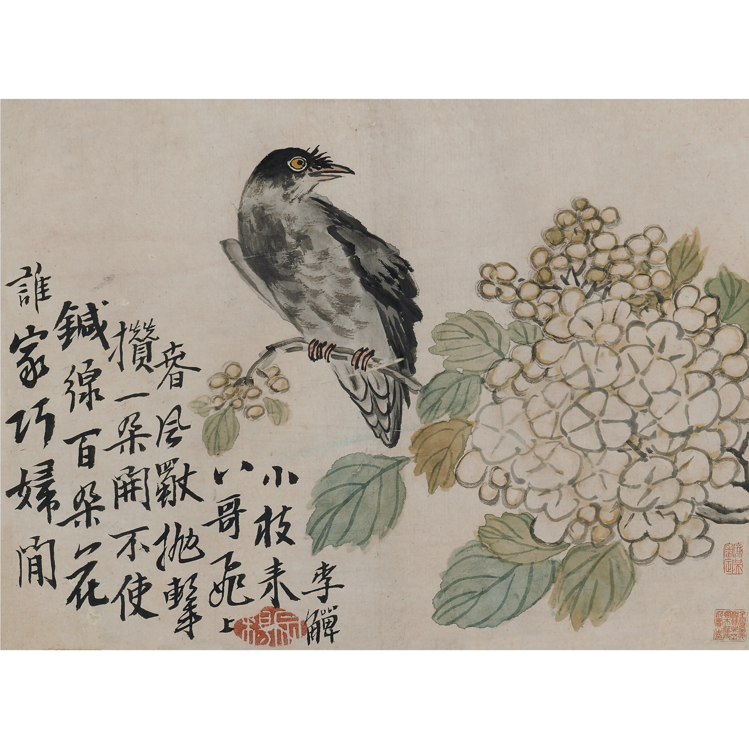 款識:誰家巧婦閑鍼線,百朵花攢一朵開,不使春風獨拋擊,八哥飛上小枝來。李鱓。