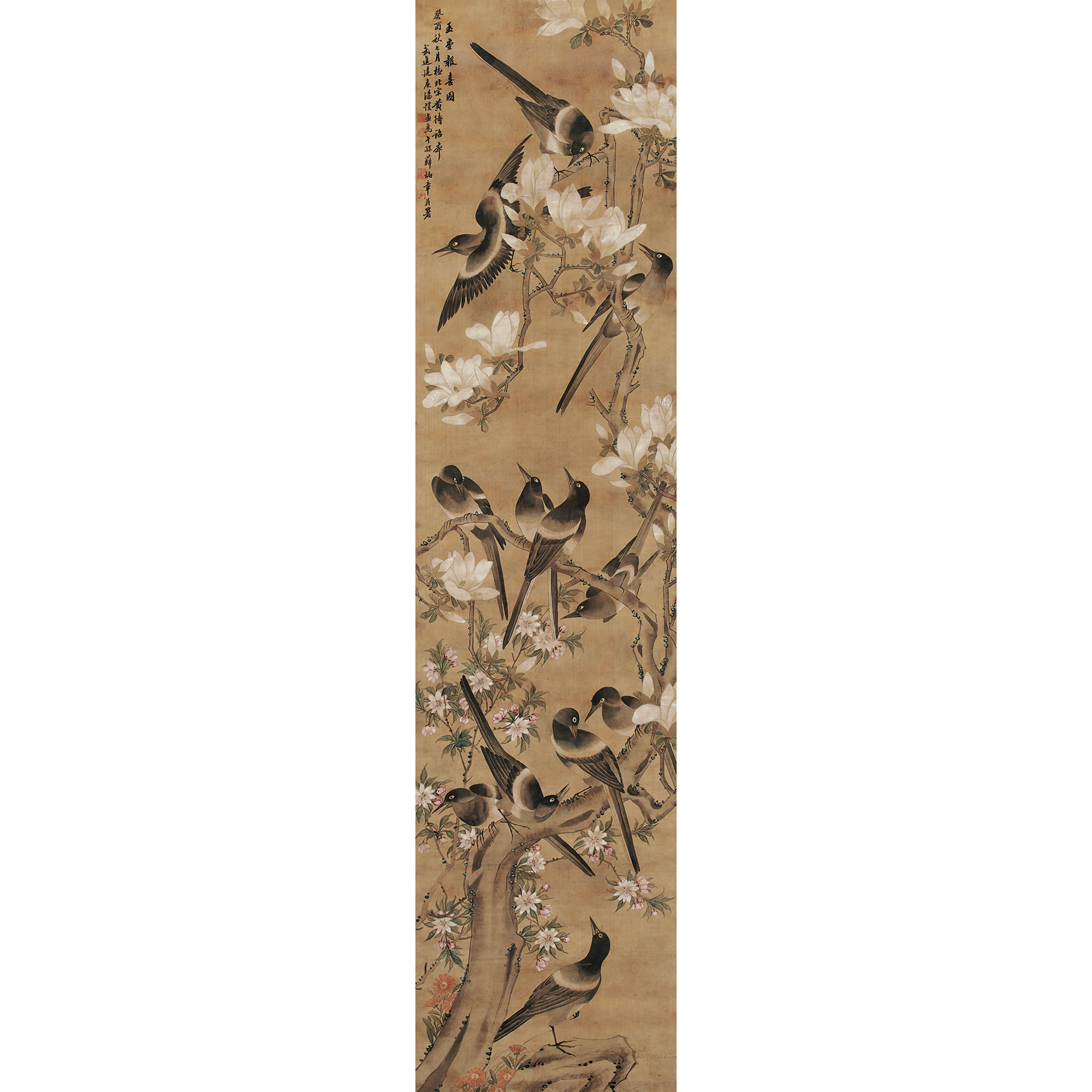 款識:玉堂報喜圖。癸酉秋七月,橅北宋黃待詔本,武進建侯湯愷畫鳥,午孫薛炳章并署。