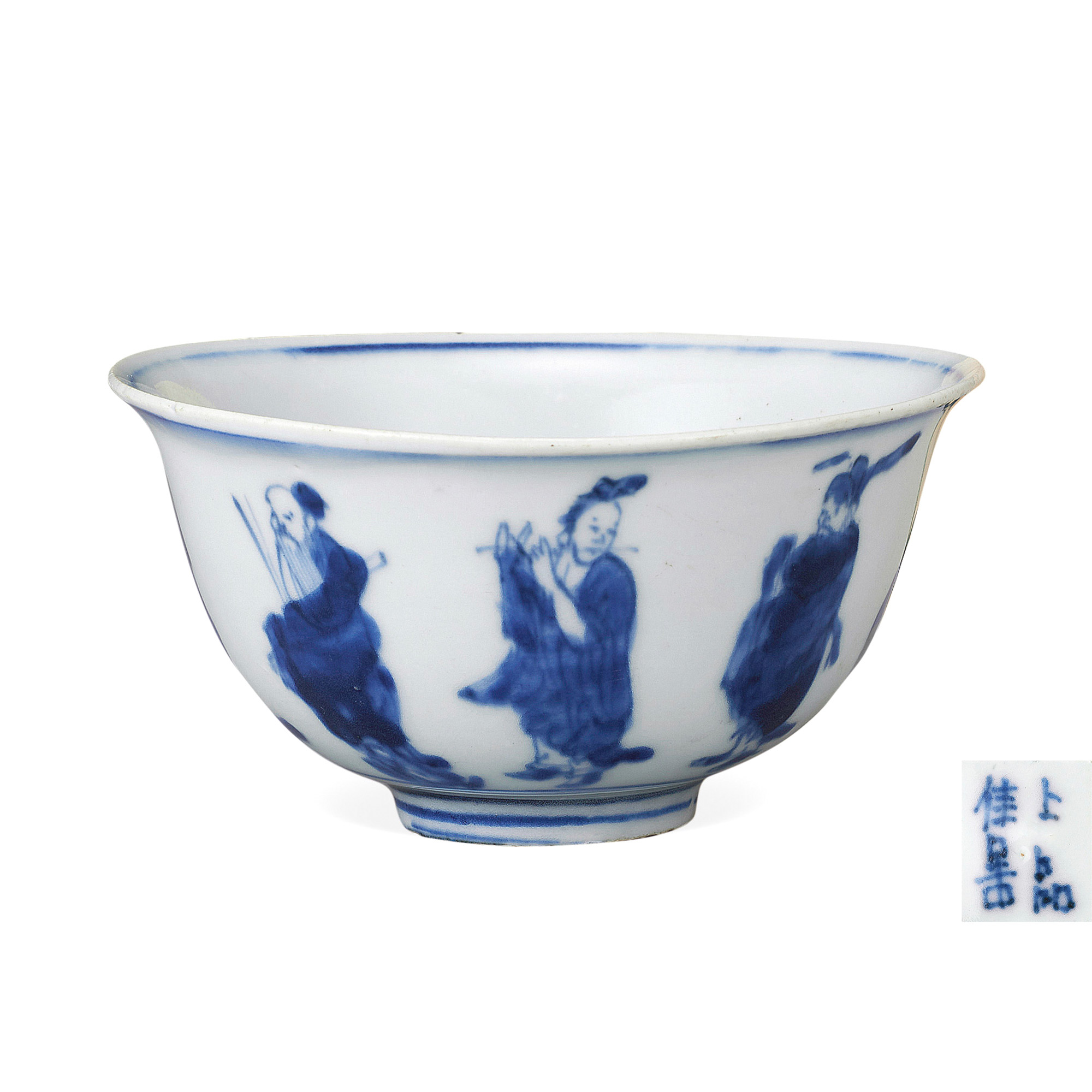 箱書:明染付 八仙圖碗 竹世 高台内「上品佳器」銘